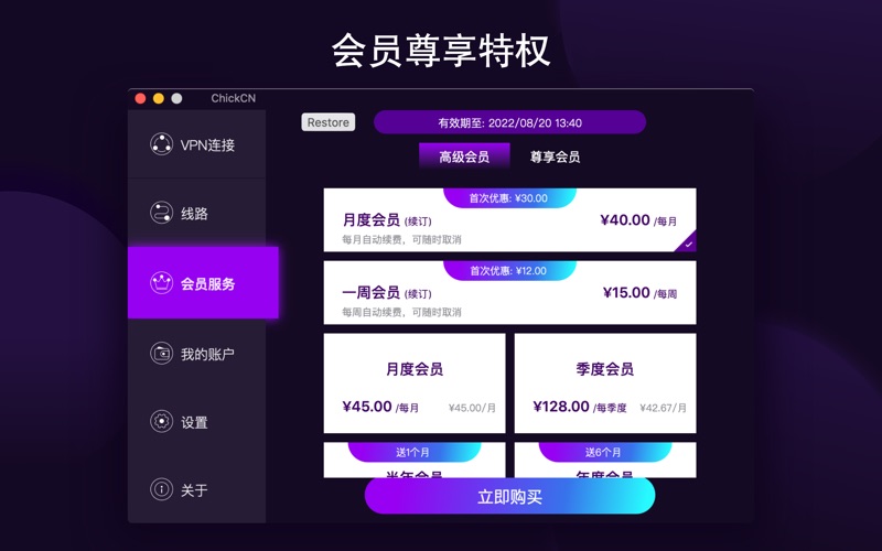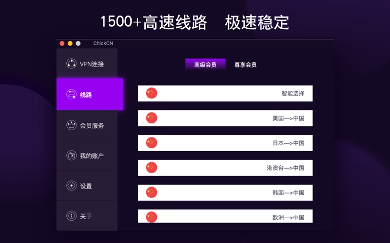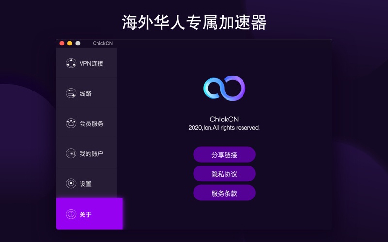 ChickCN,帮助海外华人访问国内应用,一键加速Bilibili、优酷、爱奇艺、腾讯视频、CCTV、芒果TV、CNTV、腾讯体育、QQ音乐、网易云音乐、虾米音乐、喜马拉雅、韩剧TV等国内主流音视频应用,ChickCN帮你解决海外连接问题。 ChickCN 加速器 【稳定】全球专线,极速稳定。 【便捷】一键加速,不需任何配置,游戏音乐视频即可同时加速。 【共享】一次购买,多台设备可同时享受在线加速。 ChickCN加速器,无需注册,免费线路,一键回国! ChickCN加速器,海外华人加速首选的专业网络工具 ChickCN加速器,海外华人高速畅游国内网络 ChickCN加速器,快速,简单,安全可靠 ------多快好省,只为你------ *新人大礼:注册就送vip时长。 *多重加密,更安全:国内顶尖机房,专享带宽,高速稳定不掉线。 *使用简单,无需配置:一键连接。 ------满足多样需求------ 高清视频:优酷、爱奇艺、腾讯NBA、bilibili、CCTV5…… 畅游乐海:网易云音乐、QQ音乐、虾米音乐…… 高速稳定延迟低:畅玩各种热门游戏 ------总有一种方式联系我------- 如果你不喜欢我,请及时给我们反馈,为你,我们会努力改进! 有任何意见或建议,可以通过以下方式联系我们: ChickCN全球粉丝群:942409942 ChickCN客户端:我的——问题反馈 更多福利,请关注公众号:小鸡加速器 请遵守中国和服务器所在地的法律,严禁一切违法犯罪活动! VIP自动订阅服务说明 1、订阅服务:ChickCN加速器 VIP连续包月(1个月)和连续包周 2、订阅价格:以应用内套餐价格为准。 3、付款:用户确认购买并付款后计入iTunes账户 4、苹果iTunes账户会在到期前24小时内扣费,扣费成功后订阅周期顺延一个订阅周期 5、如需取消订阅,请打开“App Store” --> 选择"查看我的账户",进入"查看信息"页面,点击“订阅”,选择Chick加速器 VIP 取消订阅。如未在订阅期结束的至少24小时前关闭订阅,此订阅将会自动续订。 隐私协议:http://ad.17youfang.com/PrivacyPolicy.html 服务政策:http://ad.17youfang.com/TermsofUse.html 1、新增优惠券系统,购买更优惠; 2、优化积分系统,完成任务即可抽取VIP时长; 3、提高App连接稳定性; 4、修复用户反馈的其他小问题。