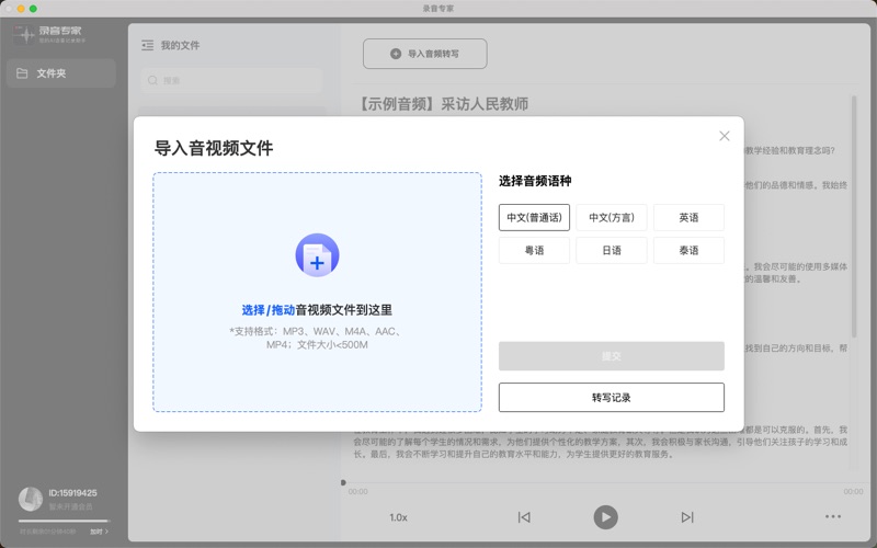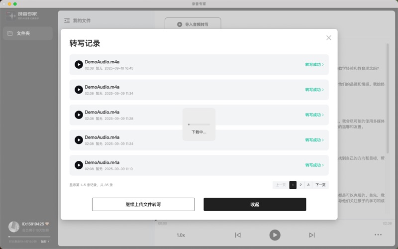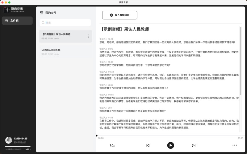 录音专家—专注于极致的音频转文字体验!倾力打造高精度、高效率的音频转文字专业工具。 【核心亮点】 ● 精准转写:采用先进的AI语音识别模型,针对会议、讲座、访谈等场景深度优化,转写准确率大幅提升。 ● 高效整理:一键导出Word格式,方便您进一步编辑、分享与存档,极大节省您整理录音的时间成本。 ● 隐私安全:您所有的音频数据处理均在本地完成,保障商业机密与个人隐私绝对安全。 ● 原生体验:专为macOS设计,带来流畅、优雅的原生操作体验,与您的苹果设备无缝契合。 【录音专家VIP自动订阅服务说明】 1、订阅服务:录音专家VIP连续包周(1个周)、录音专家VIP连续包月(1个月) 2、订阅价格:连续包周产品为首周18元次周28元,连续包月产品为28元/月 3、付款:用户确认购买并付款后计入iTunes账户 4、苹果iTunes账户会在到期前24小时内扣费,扣费成功后订阅周期顺延一个订阅周期 5、如需取消订阅,请打开苹果手机“设置”--进入“iTunes Store 与 App Store”--点击“Apple ID”,选择"查看Apple ID",进入"账户设置"页面,点击“订阅”,选择录音专家VIP 取消订阅。如在订阅期结束的至少24小时前关闭订阅,此订阅将会自动续订 6、用户协议:https://copy-book.oss-cn-hangzhou.aliyuncs.com/link/LuyinTu/User-agreement.html 7、隐私协议:https://copy-book.oss-cn-hangzhou.aliyuncs.com/link/LuyinTu/Privacy-policy.html 8、连续订阅协议:https://copy-book.oss-cn-hangzhou.aliyuncs.com/link/LuyinTu/luyintu_ios_subscribe.html -新增录音实时转写功能,一边录音,文字同步生成,沟通记录再无遗漏 -修复已知bug,优化功能体验