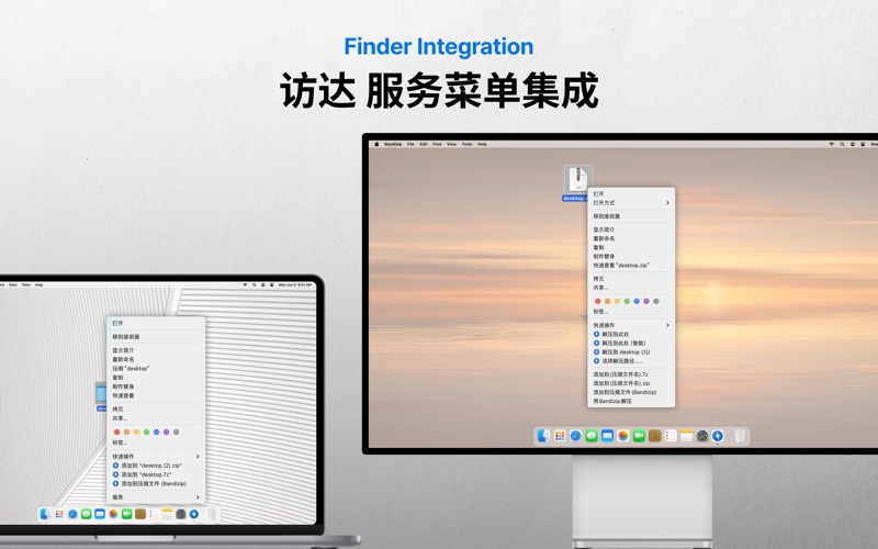Bandizip 在 macOS 上提供快速的解压速度、多样化的功能和直观的用户界面。 它不仅可以轻松解压ZIP、7-zip(7z)等常用压缩文件,还可以解压RAR(包括RAR7)、EGG、ALZ等压缩文件,并支持大多数压缩文件。 适用于macOS平台的一体化归档 您可以通过月度订阅来使用Bandizip快捷而强大的功能。 订阅成功后,所有功能均与单次购买的Bandizip版本相同。 免费提供为期1周的体验时间。 # 主要功能 •全包压缩/解压缩/浏览/编辑应用程序 •支持操作系统: Big Sur (11.0), Monterey (12.0), Ventura (13.0), Sonoma (14.0), Sequoia (15.0), Tahoe (26) •提取30多种格式,包括:RAR/RAR5/RAR7/7Z/ZIP # 压缩 •压缩成ZIP和7Z,TAR,GZ,TGZ格式的文件 •ZIP文件修改(添加/删除/重命名) •使用多核时压缩率比Finder可以最多快6倍 •创建加密归档文件 •支持AES256加密算法 •支持4GB +大小的文件压缩 •ZIP格式的Unicode或MBCS文件名 •创建ZIP/7z格式的多卷归档文件 # 解压 •支持的格式: 7Z, ACE, AES, ALZ, ARJ, BH, BIN, BR, BZ, BZ2, CAB, Compound(MSI), DEB, EGG, GZ, IMG, ISO, ISZ, LHA, LZ, LZH, LZMA, PMA, RAR, RAR5, SFX(EXE), TAR, TBZ, TBZ2, TGZ, TLZ, TXZ, UDF, UUE, WIM, XPI, XXE, XZ, Z, ZIP, ZIPX, ZPAQ, ZST •轻松查看归档文件列表 •只提取选定的文件。也支持拖放 •ZIP和RAR格式的归档注释可用 •一站式提取TGZ/TBZ格式的文件 Terms of use: https://www.apple.com/legal/internet-services/itunes/dev/stdeula/ • Fixed an issue where icons were not displayed in the Finder menu. • Added a switch to allow external symbolic links via the command line. • Other minor UI improvements and stability improvements