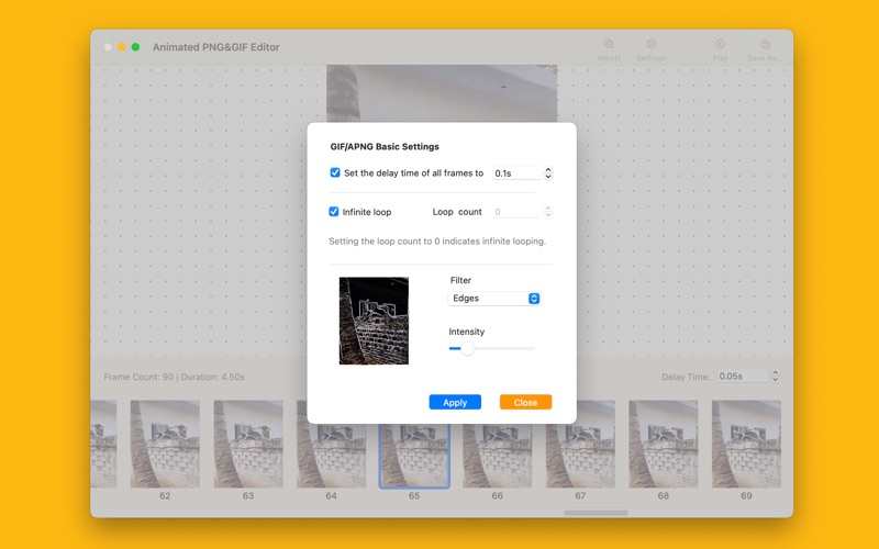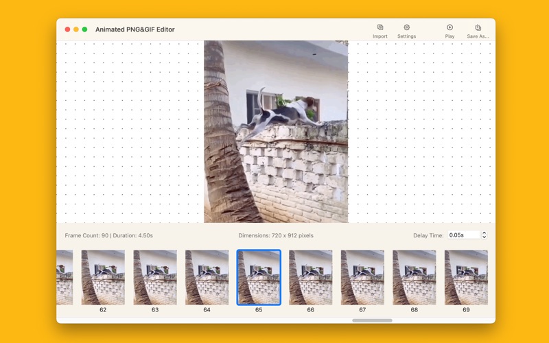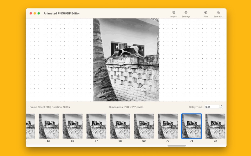 Animated PNG & GIF Editor 可用于预览、编辑和管理 APNG 和 GIF 格式的动画图像。支持帧级控制、格式转换和滤镜应用。 1. 预览动画 实时查看 APNG 和 GIF 动画,支持逐帧播放。 2. 查看帧属性 显示每一帧的详细信息,包括延迟时间和尺寸。 3. 编辑帧时间 修改单帧或多帧的延迟时间,以调整动画速度。 4. 设置循环次数 自定义动画循环的次数(如无限、一次或指定次数)。 5. 删除帧 一键删除不需要的帧。 6. 插入新帧 在任意位置插入一张或多张图片作为帧。 7. 替换帧 更换所选帧的图片,同时保留其时间和位置。 8. 格式转换 将 APNG 保存为 GIF 将 GIF 保存为 APNG 9. 提取帧 将 APNG 或 GIF 中的所有帧导出为单独的 PNG 图像。 10. 重排序帧 通过拖放方式重新排列帧的播放顺序。 11. 添加滤镜 为动画图像添加视觉效果。 APNG 简介 APNG(动画便携式网络图形)是 PNG 格式的扩展,支持带有 24 位色彩和 8 位透明度的动画。它向后兼容 PNG,是 GIF 的高质量替代方案。 使用场景 - 创建或编辑表情包、动画贴纸等 - 预览 UI 动画 - 为 GIF/APNG 添加滤镜效果 - 将 GIF 转换为 APNG - 将 APNG 转换为 GIF - 提取并查看动画帧 • 修复了错误并提升了稳定性 • 新增滤镜支持
