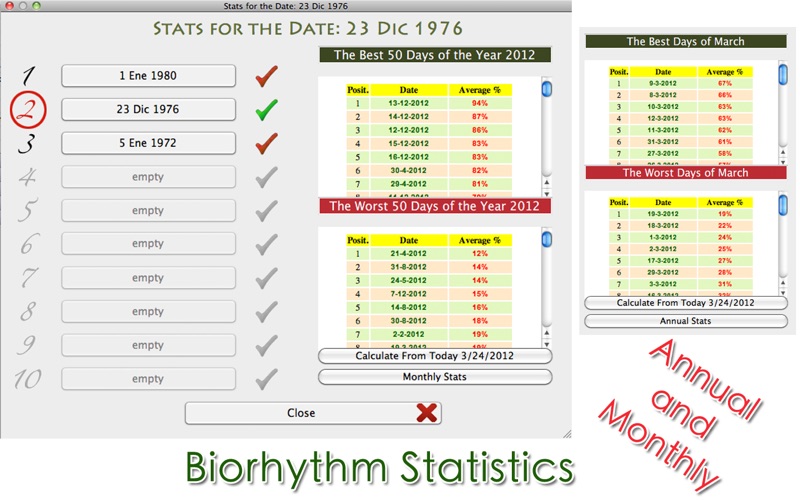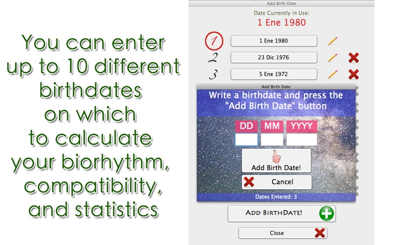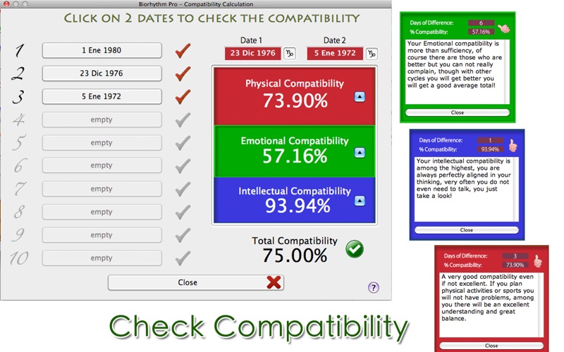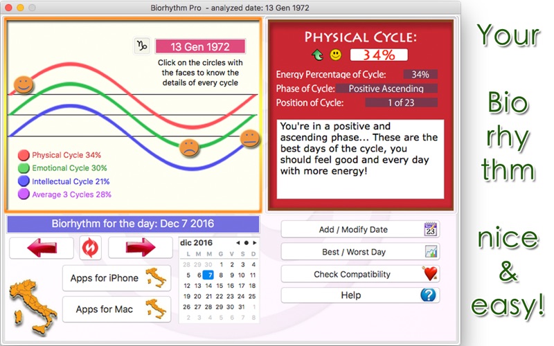 ▲△▲△▲ Biorhythm Pro ▲△▲△▲ Biorhythm Pro是生物节律周期的计算器,它将让你每天知道你的三个生物节律周期,身体周期,情绪周期和智力周期的条件。 这样,你可以以最好的方式管理你的生活,因为你总是知道有多少物理,智力和情感能量。 您还可以计算您与另一个人之间的生物节律兼容性,发现每个周期的兼容性百分比和兼容性的总体百分比。这样,你会知道什么是你最好的合作伙伴在爱,在商业和体育! 您还将有一个生物节律日历,您可以在其中发现任何过去或未来日期的三个周期的条件。 Biorhythm Pro的另一个有用的特殊功能将给你每月和每年的三个生物节律周期的统计,所以你会知道哪些是最好的天和一年中最糟糕的天和每个月。 众所周知,我们的生活受生物节律周期的强烈影响,因此,提前知道你的三个生物节律周期的条件,这将是非常有帮助的,它一定会帮助在爱,工作和运动的事情! 生物节律的优势 ▷最多输入10个出生日期 ▷计算两个出生日期之间的兼容性 ▷计算出生日期的最佳和最差日期 ▷生物节律日历查看上述三个周期的条件 ▷语言:英语,西班牙语,意大利语 IN ENGLISH: Biorhythm Pro is a calculator of biorhythm cycles that will let you know every day the condition of your three biorhythm cycles, the physical cycle, the emotional cycle and the intellectual cycle. This way you can manage your life in the best way because you will always know how much physical, intellectual and emotional energy to expect. You can also calculate the biorhythm compatibility between you and another person discovering the percentage of compatibility for each cycle and the overall percentage of compatibility. This way you'll know what is your best partner in love, in business and in sports! You will also have a biorhythm calendar where you can discover the conditions of the three cycles in any past or future date. Another useful special feature of Biorhythm Pro will give you monthly and annual statistics of the three biorhythm cycles, so you'll know which are the best days and the worst days of the year and for every month. It is well known that our lives are strongly influenced by the biorhythm cycles, so it will be very helpful to know in advance the conditions of your three biorhythm cycles, it will certainly help in matters of love, work and sports! Strengths of Biorhythm Pro ▷ Enter up to 10 dates of birth ▷ calculates the compatibility between two dates of birth ▷ Calculates the best and worst days of the date of birth ▷ biorhythm calendar to see above the conditions of the three cycles ▷ Languages: English, Spanish, Italian - Resolved a bug with localization - App optimised for OS 10 - Graphic improvements - Added the possibility to consult future and past days - Minor bugs resolved