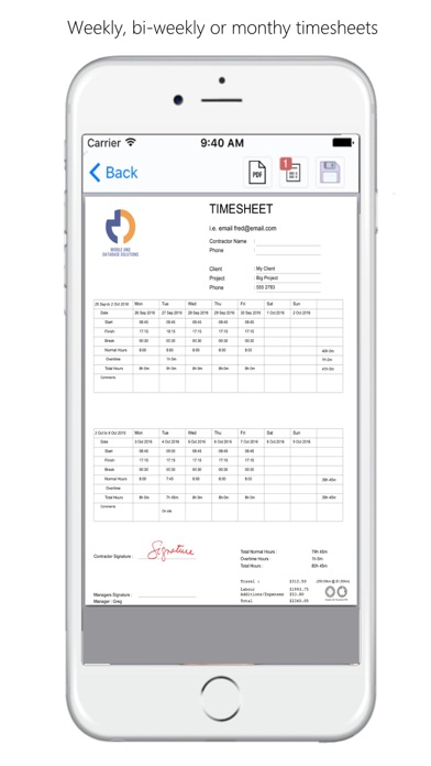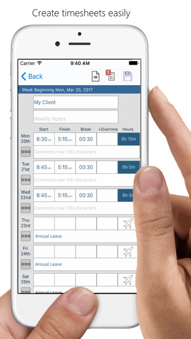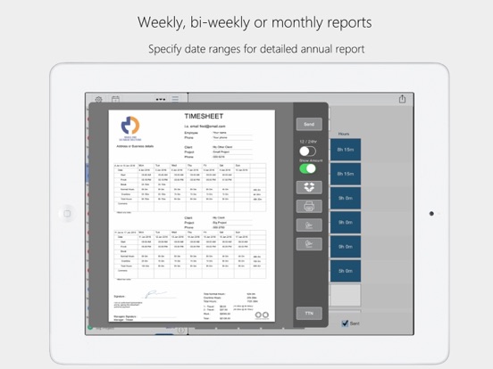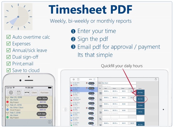 考勤表替代纸张或excel考勤表,为您创建一个简单程序的周时间表。 只需选择日期和客户- >输入计费小时 - >签名 - >发送PDF考勤表给经理审批 '功能包括: - 多个客户,项目 - 设置默认起始周 - 默认开始和结束时间,轻松入门 - 设置时间间隔,即15,20,甚至1分钟 - 标准和加班时间。 - 使用日期选择器轻松选择时间。 - 从设备的照片库自定义标志 - 签字,并通过电子邮件附件发送PDF格式的考勤表 - 同步到设备日历(iCal) - 导出CSV每周总计历史。 - 标记已发送或已支付的考勤表 - 编辑和删除整个考勤表 - 每天可选注释 - 每周可选行驶距离。 - 当超过每天工作时间时,自动计算加班时间,或者手工录入加班时间 -------------------------------------------- 这是一个免费的应用程序下载。在应用程序的用户可以购买12架个月的订阅 可用订阅: 时间表PDF12个月:$ US3.99 •订阅将自动更新,除非当前期结束超过24小时之前取消。你会被收取续期24小时本期结束的范围内,对于同一时间,在目前的认购率的产品。 •您可以通过您的帐户设置关闭订阅自动更新,但是你是不是能够其活动期间取消当前的订阅。 •付款将在购买和免费试用期的任何未使用部分的确认记入您的iTunes帐户,如果提供,将在购买认购,出版没收。 --------------------------------------------- 你可以在这里找到我们的隐私政策条款和条件: http://www.mobileanddata.com.au/privacy.html Added Search feature - tap down arrow