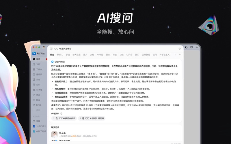 钉钉,AI时代的工作方式。 作为智能化的企业级协同办公与应用开发平台,钉钉以AI和数字化技术为核心,服务超千万家企业与组织。10年来坚持用智能技术为企业赋能,帮助打造敏捷、高效、富有创造力的数字化组织,实现从协作到业务的全链路升级。如今,80%的中国500强企业共同选择钉钉,包括人民日报、中国联通、中国广电、一汽集团、宁德时代、赛力斯汽车、新浪微博、虎扑、中国铁建、太平洋保险、申通快递、长龙航空、柳钢集团、蒙牛、安踏、立白、百丽国际、宇树科技等,覆盖各行各业的标杆客户。钉钉以AI驱动协作,以智能连接价值,让每个企业更快、更强、更具创造力。 你可以这样打开钉钉: 1、Al钉钉,简洁、高效、以人为本 【智能办公就用 Al钉钉】 操作高效,视觉美观:效率岛,智能判断当前最重要的信息,一键触达。 沟通即业务:聚焦话题,降噪沟通,通过AI分析让业务和知识高效流转 AI办公小助理(DingTalk A1):通过钉钉AI办公小助理,自动生成总结纪要、行动待办、分析报告,还能同步AI表格。提升效率,让工作更轻松 【协同创作就用 文档AI】 智联万物,协作无阻:支持在文档中插入表格、脑图、群聊、日程、视频、任务流等丰富元素,让分散琐碎的工作信息在文档中有序呈现,团队即时协同互动,无缝协作。 Al帮你创作,灵感无限:创意构思、方案策划、信息整理,Al帮你唤醒灵感一刻;丰富内容、改写语气、润色文案,创作本就如此轻松。 【高效开会就用 会议AI】 自动匹配发言人字幕:钉钉会议可精准定位多人会议中的发言人,让观点碰撞清晰有序,同时实时识别会议语音并呈现字幕,嘈杂环境或出差路上也能及时看到讨论内容,随时随地,流畅开会。支持AI听记与实时问答,用AI重塑会议互动体验,提升效率 AI时代的记录方式:闪记升级为“AI听记”,30+行业场景模板,支持声纹自动识别发言人。 2、智能、开放、高效的的协作体验 【文档AI】:一切信息皆可联通,多人编辑实时协同,让团队经验有效沉淀,让知识流转畅通无阻。 【会议AI】:Al实时字幕智能转写,多端快捷切换流畅体验,还可共享屏幕和文档实现多人在线编辑,或通过表情、气氛、状态对他人观点表态,打破线上交流的距离感,远程开会也和面对面一样。 【项目AI】:丰富项目模板开箱即用,满足企业个性化需求,深度打通钉钉文档、群聊、OA审批、Agoal等,消除数据孤岛,实时跟进项目进展,结构化沉淀团队经验。 【日历AI】:通过自然语言输入轻松创建日程,智能推荐会议时间及场地,一键查看参会人忙闲,灵活进行日程规划,个人待办明晰有序,团队调度轻松安排。 【全球化能力】:全界面翻译和系统应用支持超 20种语言,海外大量加速节点让协作环境更稳定,国际化会议自动推荐全员适配时段,企业出海无阻碍,跨国合作有保障。 3、企业级组织数字化和业务数字化平台 【AI表格】:让每个人成为AI应用“创造者”,无需开发,像做表格一样,轻松搭建业务系统。丰富的500强企业同款模板,开箱即用,客户管理、门店管理、经营分析、招聘管理等业务系统轻松上手,会用表格就会搭。 【AI 搜索】:企业+全网信息一搜即得,答案、方案、计划一步到位。 【钉钉宜搭】:业务创新,一搭就行,仓库通、任务通、客户通等精品模板开箱即用,人人都是创造者。 【钉钉管理套件】:提供人事管理、财务管理、差旅管理、客户管理、合同管理、招聘管理等一站式管理数字化方案,助力企业经营升级。 【钉钉LTC解决方案】:为企业提供目标制定拆解、销售跟进、项目交付、持续服务的端到端一站式平台 4、联系钉钉 支持通过「我的-客服与帮助-在线服务/热线服务」进行咨询,你的体验,非常重要。 8.2.0 版本|全新钉钉 畅通无阻!修复了一些问题,持续给您更好的体验