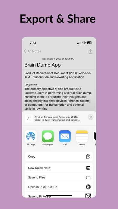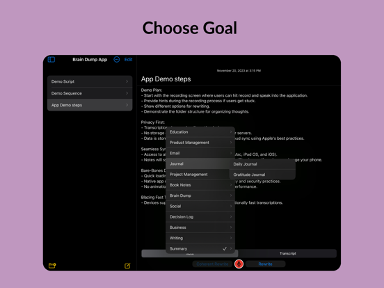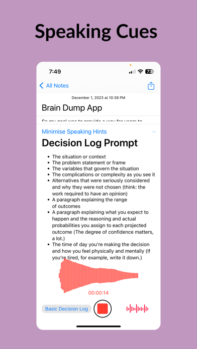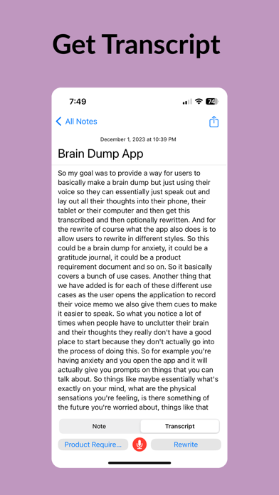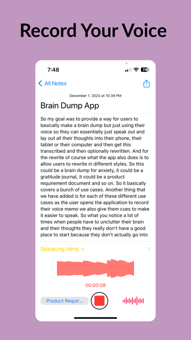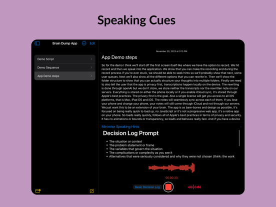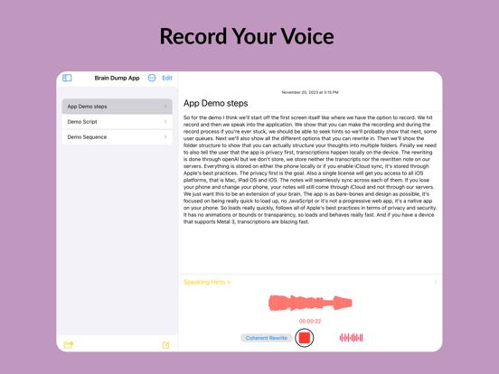 脑力速记是您的个人语音转文字笔记本,精准捕捉并优化您的想法。无论是头脑风暴、语音备忘、会议记录还是备忘录,脑力速记都能让语音到精炼文本的过程顺畅无阻。 脑力速记还支持在本地设备上转录苹果语音备忘录及其他音视频文件。 除了iCloud同步,脑力速记还能直接写入Markdown文件,方便在Obsidian等Markdown应用中使用。 适用场景 1. 日志爱好者:从每日反思、旅行日记,到饮食目标追踪和记录宠物、宝宝的珍贵时刻,脑力速记是陪伴您生活的日记助手。 2. 商务人士:无论是产品需求、商业策略还是团队汇报,脑力速记都能高效整理和优化您的专业文档。 3. 学生与学者:录制并总结讲座为学习笔记,提炼作业研究,或梳理学术写作章节,脑力速记助您高效转录与编辑。 4. 作家与创意人:捕捉角色设定、情节要点或社交媒体内容,包括推文和文章。 5. 个人成长者:用于决策日志、战略思考,或记录可执行见解,助力持续成长。脑力速记是追求卓越的理想工具。 6. 医疗从业者:快速录入并整理SOAP病历、患者观察及治疗方案,保障隐私与专业。 核心功能 1. 高精度转录:将语音准确转为文字,便于记录灵感和笔记。 2. 上下文重写:不仅转录,还能根据您的风格和意图,将原始内容优化为简明流畅的文本。 3. 语音备忘转文字:录制语音备忘,自动生成结构化、可编辑的笔记。 4. 轻松整理:按类别管理想法,便于查找和管理语音笔记与音频日记。 5. 隐私优先:数据安全存储于iCloud,仅您可访问,保障隐私。 什么是脑力速记? 这是一款AI驱动的语音转文字应用,类似Happy Scribe、Transcribeme、Voicepop、voicenotes、audiopen、notta、audionotes和otter ai。 可以免费转录吗? 您可免费试用7天,之后需订阅付费。 订阅详情: 如需使用重写功能,需订阅。详情请见应用内。我们提供周、月、年订阅选项。 轻松录音、转录、优化您的想法。 支持audiopen、audionotes及Huberman日记协议 使用条款:https://voicebraindump.com/tos Faster more accurate transcription. Better text editor supporting full markdown.