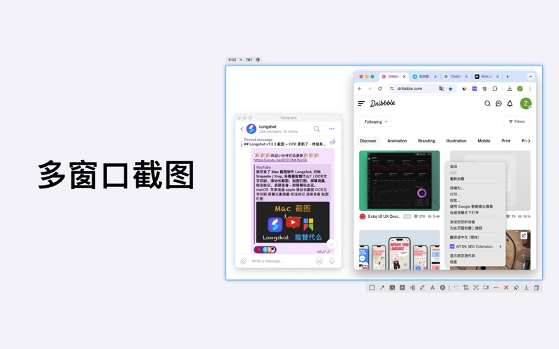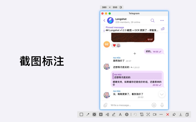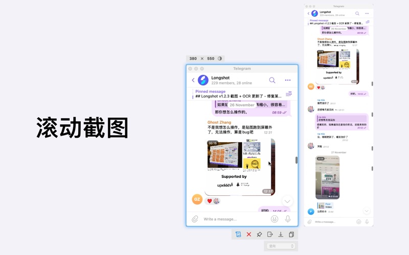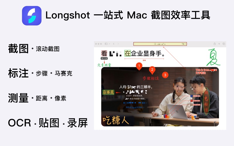 ### 标注取色 方便地标注屏幕,同事交流沟通的好帮手,简洁方便。 - 涂画工具, 矩形、椭圆、线条、箭头、文字、马可笔,随手涂鸦。 - 标注测距, 马赛克、模糊隐藏、标注说明、测量像素距离、取色标注,功能丰富。 - 步骤标注, 清晰明了表达意思,自定义数字内容 - 操作便捷, 快捷键、撤销、保存、打开、复制到剪切板,简易简单。 ### 滚动截图 优化的图像拼接算法,使滚动截图适应各种环境,轻松截取对话上下文。 - 竖向/横向/360度, 支持竖直方向、水平方向,全景滚动截图,想滚哪滚哪截取。 - 非纯色背景/非滚动区域, 即使滚动区域背景为非纯色,截取区域包含非滚动对象,也能很好的滚动拼接。 - 动态调整滚动方向/区域, 滚动中,可随时改变滚动方向,完成时,可再次拖动截取区域,再次拼接。 - 整窗口滚动截图, 点选窗口,可整窗口滚动拼接长截图,自动处理边缘区域。 ## OCR文字识别 离线OCR算法,注重隐私保护。迅速提取图片、视频、文档等任何地方中的文字。 - 框选屏幕区域,识别文字,复制到剪切板,粘贴到笔记、编辑、消息等任何应用。 - 支持 QR 和 barcode 识别, 迅速打开对应链接。 - 支持语音播报识别到文字。 ### 屏幕元素测量 迅速测量屏幕上的任何内容,自动识别距离,元素大小。 - 测量距离,屏幕上元素或物体的距离自动识别,标注距离。 - 测量元素,只需框选元素大概区域,并能自动吸附捕捉元素,标注尺寸。 - 支持调节距离、元素边缘探测颜色容差调节,更加精确的定位元素。 ### 贴图钉图 把任意地方的图片、文本变成便签贴在桌面上,方面查看对比。 - 剪切板贴图, 剪切板中的图片、文本、HTML等贴在桌面。 - 双击图片钉图查看, 双击图片或者打开图片贴图在桌面,查看图片。 - 贴图滚轮缩放, 贴图鼠标滚轮缩放,双击关闭或缩小,支持翻转镜像等图片操作。 ### 屏幕录制 快速记录工作步骤,一键录制屏幕,快速分享。 - 支持全屏录制、区域录制、窗口录制、应用录制。 - 支持系统声音、麦克风录制,画面帧率设置等。 ### 窗口截图 点选窗口,突出主题,使截图区域更能表达意图。 - 智能识别窗口, 移动鼠标,自动高亮鼠标所在的窗口。 - 多窗口组合截取, 按住Shift键,点选窗口,多窗口组合截取。 ### 联系 - 详细介绍:https://longshot.chitaner.com/zh-cn/ - 邮件联系:office.chitaner@gmail.com - QQ群:780402788 ### 购买 - 买断Longshot专业版, 可无限制滚动截图、步骤标注、元素距离尺寸标注,OCR文字识别,自定义快捷键等,解锁当前所有功能。 Privacy Policy: https://longshot.chitaner.com/zh-cn/privacy/ Terms of Use: https://longshot.chitaner.com/zh-cn/terms/ - 新增贴图历史 - 新增键盘方向键滚动截图特性 - 新增拾取颜色带前缀“#”选项 - 修复GIF贴图奔溃问题 - 修复某些情况下工具条错位问题