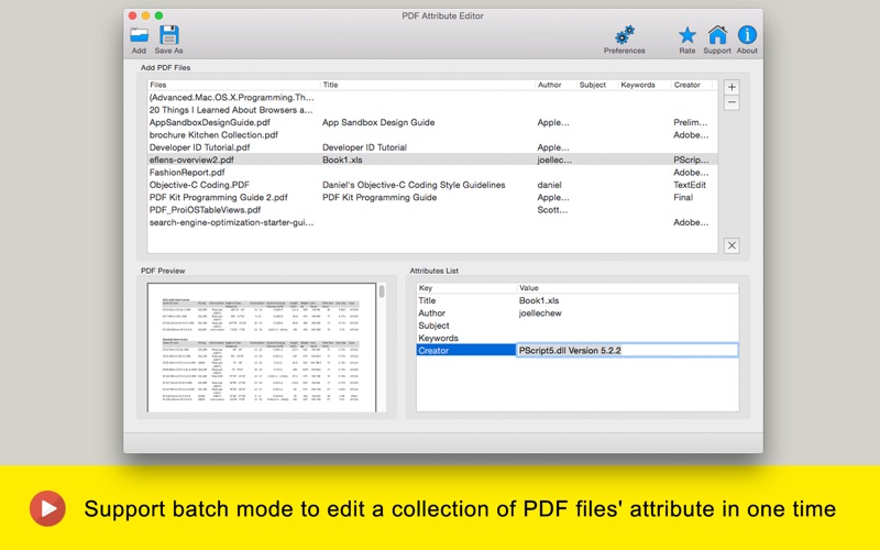 ◆◆◆限时特惠(原价$9.99美元)◆◆◆ PDF属性编辑器是一款PDF文件属性编辑软件。 PDF属性编辑器的功能包括: -编辑现有 PDF 文件的属性。 -编辑PDF标题,PDF作者,PDF分类和PDF关键词。 -支持在同一时间批处理模式编辑PDF文件的属性 -它是一个独立的应用程序,它并不需要Adobe Acrobat或其他软件便可以独立进行工作。 ◆◆◆联系方式◆◆◆ 如果您有任何问题,请给我们发电子邮件support@cokesoft.com change UI to enable batch editing