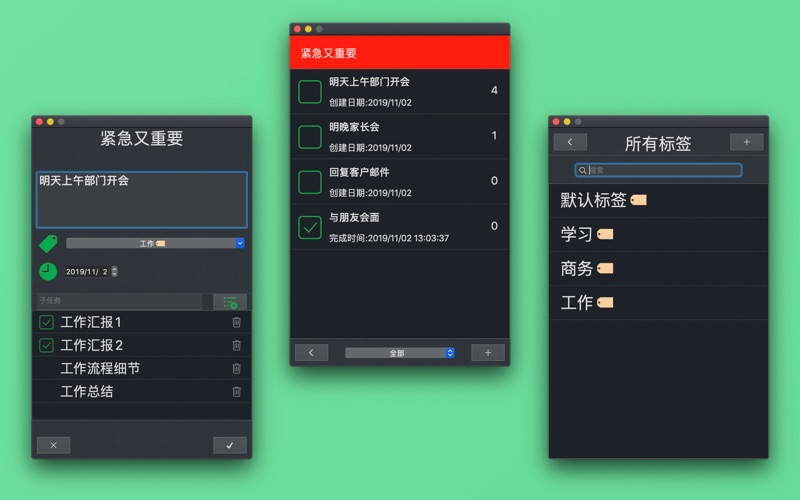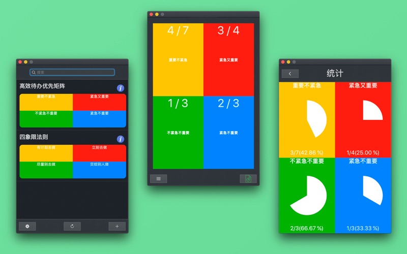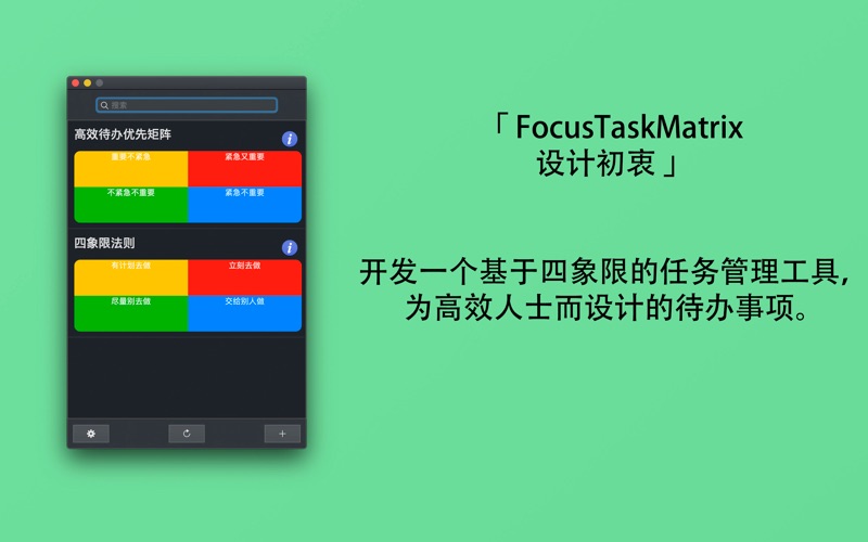 高效待办优先矩阵 (FocusTaskMatrix) 作为一个基于四象限理论的任务管理工具,希望在视觉和操作层面就将用户的使用负担降至最低,把焦点回归到待办事项本身。通过有效但极简的设计语言,和你一起高效地完成日常工作。 无论是工作计划,个人生活或家庭学习,它都会帮助你更好的完成自己的事项。 你是否经常这样: - 待办看上去都很紧急,不知道怎么决策 - 困难的事情很困难,潜意识地偏向先做简单的事情 - 刚开始做一件事情,另一件事又忽然插入 - 以为好不容易完成了所有工作,别人提示下却发现忘了某些事 - 感觉自己受待办事项控制,成为任务的奴隶 为了更好地完成工作,你该开始认真对待任务管理这件事了。虽然我们无法回避该做的事情,但至少我们可以决定如何去高效简单配置它们。 【特色功能】 • 经典理论:融合高效的四象限工作法 • 高效清单:简单明了的清单,工作、生活井井有条 • 无限制象限清单:独立管理不同象限清单,不仅限于单一的象限,井然有序 • 数据统计:统计您的数据,方便您自我分析 • 数据导出:导出CSV数据到设备 • 过滤完成进度:管理完成与未完成的待办事项 • 待办事项子条目:细分你的待办子项目 • 方便检索:快速搜索内容 • 标签分类:定制你的个人习惯 修复错误 增加了本地化语言