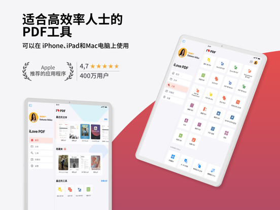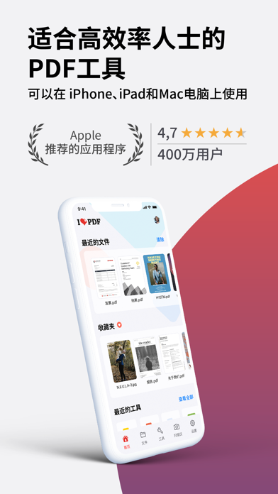 利用这个文件扫描和编辑工具,只需几分钟,你就可以阅读文件、转换文件格式、给文件添加注释,或者在PDF文件上签名。有了这个工具,你可以实现随时随地高效率工作。 手机扫描器 • iPhone和iPad扫描器:能够捕捉任何图片,然后保存为PDF格式;可以存为多个PDF。 • OCR文本识别: 能够将扫描的文本或图片转换为PDF格式,同时保持高准确度。 PDF转换器 • JPG转PDF:给文件拍照,然后将其保存为PDF格式。 • Office 文件转换器:将Office文件转换为PDF格式;将你的PDF文件转换成可编辑的Office文件,例如:Word、Excel、PowerPoint。 • 从PDF文件中提取图片:从你的PDF文件中提取图片,并保持高质量;将图片转换为单个或多个PDF文件。 PDF编辑器 • 给PDF文件添加注释:你可以突出显示某些文字,操作简便;给PDF文件添加注释和笔记、写下评论、绘制或插入图片。你还可以选择注释的格式。 • 填写表格和签名:快速填写PDF表格、输入文本,然后用手指进行电子签名。 • PDF阅读器:随时随地查看、编辑和修改存储在云空间或设备上的PDF文件。 优化、整理和保护文件 • 压缩PDF文件:降低文件的尺寸,同时保持视觉质量。 • 合并PDF文件:将多个文件合并为一个PDF文件。 • 拆分PDF文件:拆分PDF页面,或者提取页面,并将它们存为多个PDF文件,同时保持高质量。 • 旋转PDF文件:旋转PDF文件中的页面,并调整它们。 • PDF文件加密:删除或添加PDF文件的密码 • 给PDF文件添加页码:自定义你的PDF文件。选择页码的位置、样式和大小。 • 给PDF文件加水印:选择图片或文本,将它们添加至PDF文件中。选择位置、透明度或字体,以达到最好的效果。 连接至你的Google Drive和Dropbox帐户,以便从云空间选择和分享你的文件。 升级至高级账户,即可享受这款PDF编辑器的所有功能。你可以通过以下自动续费的订购方式来购买iLovePDF高级版: • 可选择按年付费或按月付费的订购 • 付款将从你的iTunes账户中收取 • 将在当期结束之前的24小时内,从账户中收取费用。 • 用户可以对订购进行管理;用户可以关闭自动续费。 购买后的账户设置: • 在已生效的订购期内,不允许取消当前的订购。 • 免费试用期内任何未使用的部分(如果适用),将在用户订购后失效。 使用条款:https://www.ilovepdf.com/help/terms 隐私政策:https://www.ilovepdf.com/help/privacy 关注我们的Twitter:@ilovepdf_com 关注我们的Facebook:ilovepdf.com 体验 iLovePDF Mobile 的最新版本 — 现在更快、更完善、功能更齐全! 我们解决了各种问题,为您提供更加流畅的体验。 体验超级快的 PDF 处理速度。 探索新工具,让您的 PDF 任务处理更加高效。 升级到最新的 iLovePDF Mobile 版本,全面提升 PDF 文件处理效率。