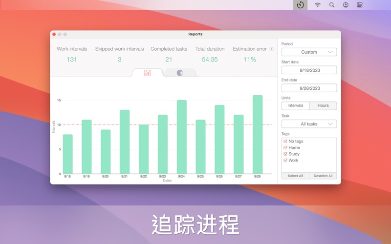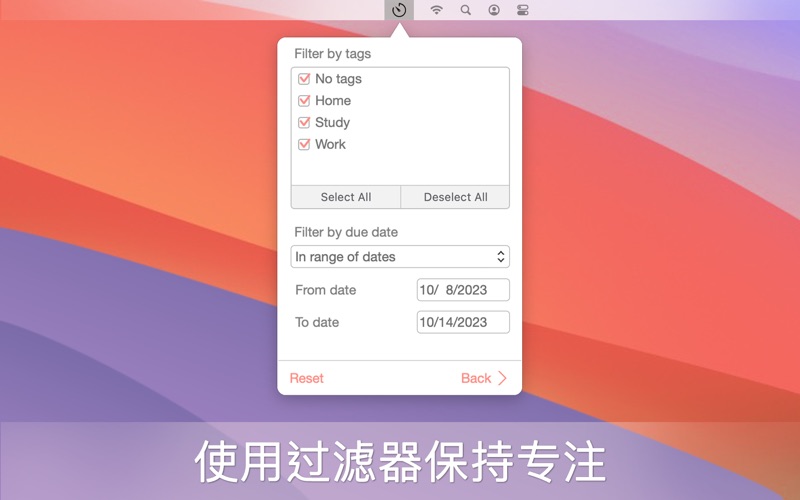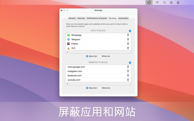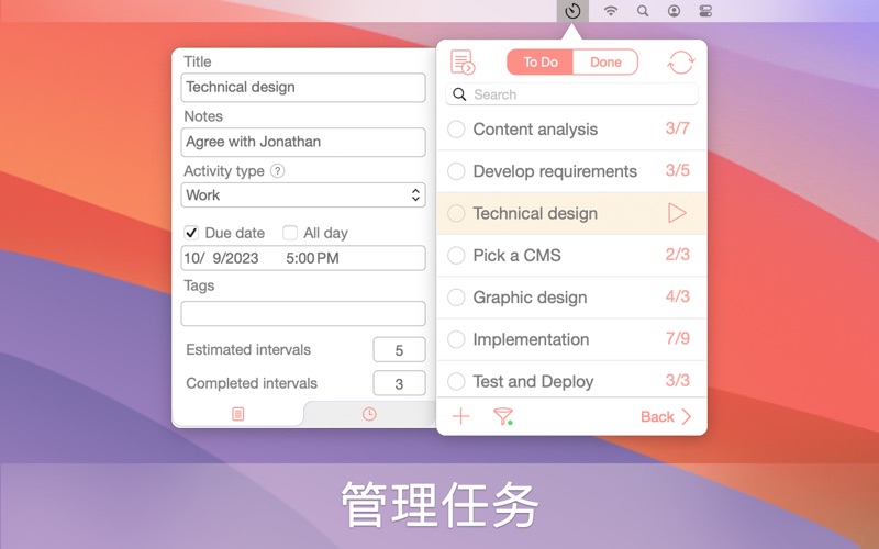 长时间工作对于我们离不开电子屏幕的这一代来说是个真正的挑战。通过将单个任务分成多段时间集中精力来完成,中间有休息,这会让你把工作做得更好。这也是保持工作激情和集中精力的极其有效的方法。它可以帮您按照每天、每周或自定义时间创建任务、计划休息时间并追踪您的进度。使用您的iPhone、iPad或Mac - 您的设备始终保持同步。 任务与间隔管理 • 创建和管理任务 • 开始、暂停或跳过间隔 • 自动开始下一个计时器(可选) • 从其他应用程序粘贴任务列表 • 为任务添加注释,标签和截止日期 • 规划完成任务所需的间隔时间并跟踪准确性 • 管理已完成的间隔 计时器自定义 • 工作间隔时长 • 短暂休息时长 • 长时间休息时长 • 长时间休息之间的间隔数量 • 每天的目标间隔数 • 为不同的任务指定不同的计时器设置 生产力跟踪 • 用于详细进度跟踪的报告 • 将数据导出为 CSV 文件 声音和通知 • 计时器滴答声(可选) • 可调节的计时器声音频率 • 多种警报声音 • 可调节的警报和计时器音量 自动化 • 与快捷指令应用集成(通过快捷指令应用控制任务和计时器) • 在 Be Focused 应用中基于事件自动执行快捷指令 专注 • 在工作期间屏蔽分散注意力的应用和网站(支持的浏览器:Safari、Chrome、Edge、Opera、Brave) • 在屏蔽其他应用和网站时,将特定的应用和网站列入白名单 • 使用标签和过滤器组织任务并保持专注 集成 • 在所有设备之间同步(iPhone、iPad、Mac)* • 与 Focus Matrix 集成,使用紧急/重要原则管理任务 ** • 与快捷指令应用集成以实现工作流程自动化 界面和辅助功能 • 桌面和通知中心的小组件 • 全局快捷键,可从任何应用启动或停止计时器 • 也适用于 iPhone 和 iPad • 支持深色和浅色模式 * 与 iOS 设备同步需要安装 iOS 版本的 Be Focused Pro(单独销售)。 ** 与Focus Matrix集成需要Pro版本的Focus Matrix,需单独购买。 • Fixed display issues on the latest macOS version • Minor improvements and bug fixes