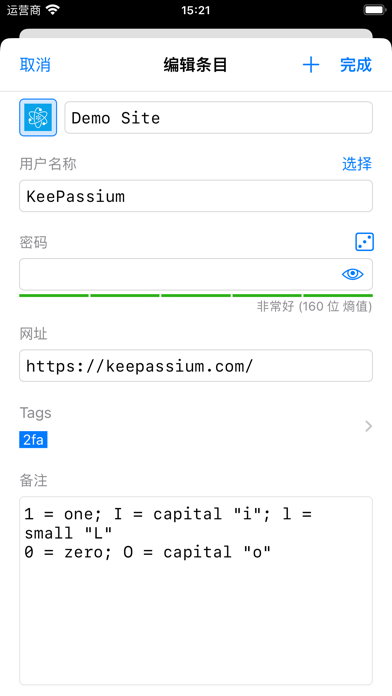 KeePassium 是一款兼容 KeePass/KeePassXC 的开源密码管理器。 专为 IT 专业人士、超级用户和隐私爱好者打造,能够让您的数据尽在掌控。 KeePassium 默认离线运行,代码可公开审查,并由 Cure53 独立审计。 安全性 • 默认离线运行 — 您可以验证的隐私保护 • 面容 ID / 触控 ID — 无需输入即可安全访问 • 通行密钥和一次性验证码 — 超越传统密码的安全选择 • 支持 YubiKey — 强大的硬件支持保护 [高级版] • 密码泄露审计 — 检测被泄露的密码 [高级版] 便捷性 • 密码自动填充 — 自动登录应用和网站 • 自动同步 — 可选,支持主流云服务提供商或您自己的服务器 • 支持多数据库 — 与家人和团队成员共享密码 [高级版] • 快速注册 — 无需切换应用即可创建新账户 [高级版] • 企业级存储 — 将工作密码存储在您公司的云端 [高级版] 兼容性 • 兼容 KeePass、KeePassXC 及其他 KeePass 兼容应用 • 支持“旁白”和大字号文本等无障碍功能 • 高级版许可证同时涵盖 iOS 和 macOS …当然还有 • 无供应商锁定 • 无分析数据 • 无广告 隐私 KeePassium 不收集任何个人数据。 我们只出售应用,不出卖用户。 • Improved: AutoFill: Passwords for new entries respect site-specific rules [thanks, everyone] • Improved: Added Cmd+T to copy entry OTP [thanks, GHubbler] • Improved: Group viewer now indicates which items are expired [thanks, A.E.] • Improved: Minor UI inconsistencies [thanks, u/SeaRain8212] • Fixed: Longer saving of AutoFill changes could corrupt database [thanks, Robin and OG] • Fixed: iOS: Rolled back field actions menu to old-style action buttons [thanks, everyone] • Fixed: Sometimes Cmd+C still copied password instead of selected text [thanks, everyone] • Fixed: AutoFill: Prevent entry creation in KDB root group [thanks, everyone] • Fixed: Auto-move entries erroneously created in KDB root group • Fixed: AutoFill: Improved logging for premium-related issues [thanks, Andy]