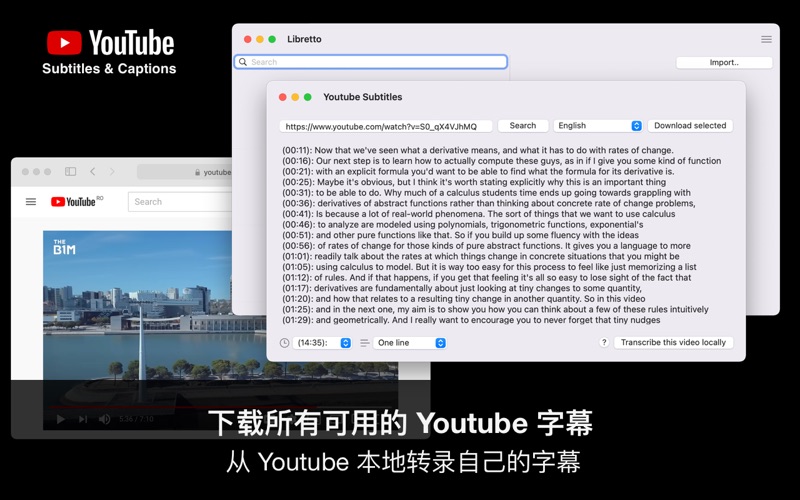 使用 Libretto,您可以将音频和视频文件转换为文本(语音转文本)。 此外,您还可以访问和下载现有的 Youtube 字幕,或从 Youtube 转录您自己的字幕。 生成的转录文本也支持语言翻译。 隐私 整个转录过程完全在您的电脑上私密进行,如果您非常重视数据和隐私,您甚至可以在转录时关闭网络连接。 如果您选择将文本翻译成其他语言,将使用 Google 翻译,这需要互联网连接。 • 使用此 App 为录制的会议、访谈、课程或电影做笔记。无需再在数小时的视频文件中搜寻所需信息 • 高质量的 Youtube 字幕,保存或搜索字幕。如果 Youtube 不提供字幕,您也可以自行生成转录 • 如果您不懂音频文件的原始语言,请使用此 App —— 将文本翻译成您的母语。您的视频是中文的?没问题,让 Libretto 为您翻译 • 将 Libretto 用作辅助功能工具,非常适合有听力障碍且希望理解电影或课程的人士。为来自 Youtube 的任何录音或电影自动生成字幕 功能 • 将音频和视频文件转录为文本 • 访问并保存现有的 Youtube 字幕和转录。如果 Youtube 不提供,您也可以生成转录 • 将结果文本翻译成任何语言(超过 140 种语言可供选择) • 支持多种文件格式:mp3、mp4、mov 以及更多媒体格式 • 直接从 Youtube 导入电影 • 导出并通过任何 App 分享转录内容 • 易于使用,简洁的用户界面 我们每天都会阅读您的支持邮件。 请放心写下任何问题、反馈或投诉,您将在极短的时间内收到回复。 我们提供两种自动续订订阅方案,以及一种一次性付款选项: • 基础版,1 个月订阅 • 高级版,12 个月订阅 • 终身访问:仅需一次性付款