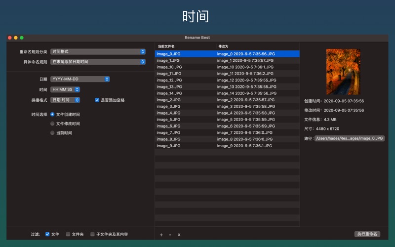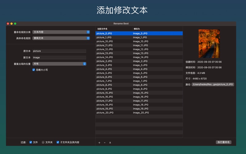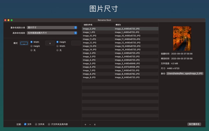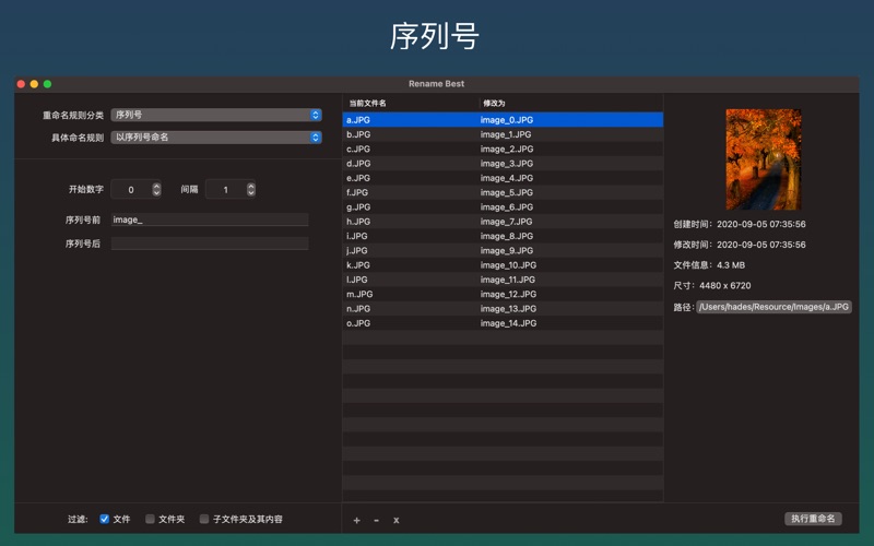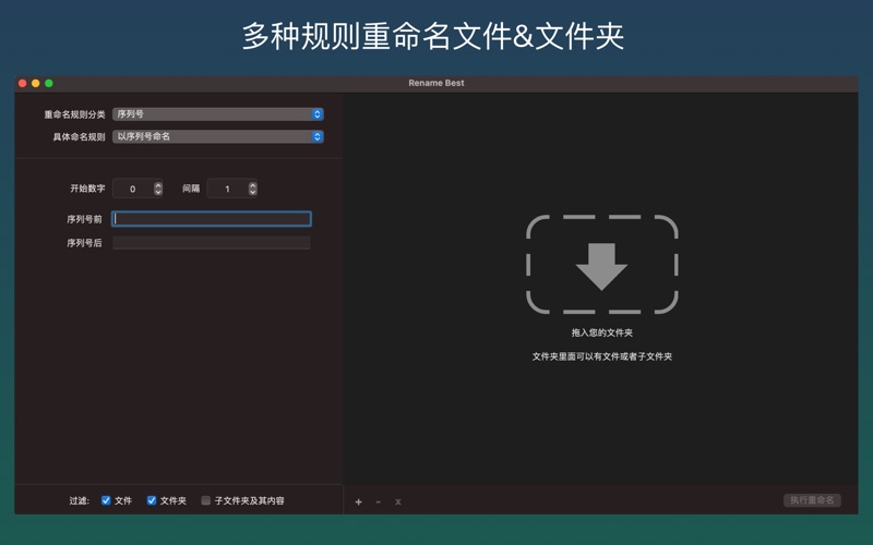 RenameBest是一个文件以及文件夹批量重命名工具,提高文件处理效率,在MacBook上一键批量重命名文件 可以批量处理 **文件夹** 以及 **子文件夹** 特点:文件名编辑规则多样化,满足各种需求 ** 照片EXIF时间,文件创建时间,修改时间,当前时间插入任意位置 ** 任意位置插入、删除自定义内容,移除某个范围内的内容 ** 数字序列号命名,随意位置插入序列号,编辑序列号起始数字和间隔,以及序列号连接符 ** 文件名大小写一键转换 ** 针对多种格式的图片文件,文件名任意位置插入图片尺寸,清晰标注图片尺寸 注意: ** 拖入文件夹到指定位置,可以一次拖入多个文件夹 ** 无网络连接,文件不会上传到任何服务器,保证文件安全无虞 **优化** -增强稳定性