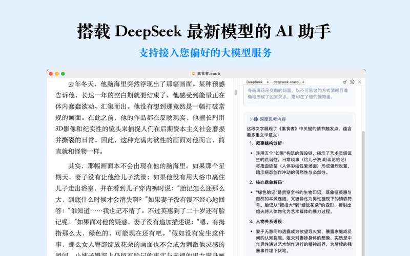 OmniReader 是一款卓越的 AI 电子书阅读器,不仅界面简洁美观,还提供了极致舒适的个性化阅读体验,让您全情投入阅读,享受每一刻。 ▸ 特性: - 文件格式多样支持 OmniReader支持多种文件 格式,包括 EPUB、CHM、PDF、TXT、RTF、FB2、HTML、MHTML、WPD、DJVU,以及 Kindle(MOBI、AZW3、PRC、 TPZ、AZW、AZW4、AZS、AZL),满足您各种电子 书籍的阅读需求。 - AI 阅读助手 搭载 DeepSeek-R1 满血版模型,智能助力您的阅读之旅。而且支持自定义大模型 API,接入您偏好的大模型服务,阅读体验更灵活。 - 强大的书籍管理 管理您的书架从未如此轻松。批量导入、拖拽导入、自由分类、搜索、自定义排序、封面 缩放、重命名、甚至对 TXT 及 CHM 书籍进行封面修改等功能,轻松整理和管理您的书籍。 - 多彩主题和自定义预设 OmniReader 内置多款主题色,如霓夜紫、雪光白、月夜蓝、远山黛、樱花粉、夏荷碧等,为您带来愉悦而舒心的阅读体验。此外,您还可以自由更换背景色、字体(种类,大小和颜色)、背景透明度等,支持一键预设为自己的主题,创造属于自己独特的阅读风格。 - 个性化的阅读体验 支持翻页、缩放、目录侧边栏的折叠和展开,让您根据个人偏好调整阅读界面。您还可以在书籍中进行标记、划线和记录笔记,按空格键翻页,以及随时根据历史浏览前进或后退。 - 好用的书签管理 在添加书签时,您可以添加备注以区分不同的书签。支持无限数量的书签添加以及集中管理,根据日期和页码排序查看,也能够根据书籍对书签进行灵活管理。根据书签,您可以轻松恢复至原来的阅读位置。 - 格式转换和强大搜索 OmniReader 支持将 Kindle、CHM、TXT、FB2、RTF、HTML 等文件转换为 EPUB 及 HTML 格式,同时还支持 EPUB、TXT、CHM 等多种电子书格式导出为 PDF。此外,强大的搜索功能包括书籍搜索、笔记搜索、书签搜索、目录搜索,以及文件名搜索,为您提供了便捷的查找体验。 - 文本朗读 点哪读哪,让您的学习效率大大提升。 支持声音,音量等自定义配置。 - 简体/繁体 支持简体和繁体互转。 - 自动滚动阅读,解放您的双手。 - 常用快捷键说明 H或左箭头:上一章,L或右箭头:下一章 J:向下滚动,K:向上滚动,空格键:滚动到下一页 T:切换左侧边栏,I:切换沉浸模式,B:切换底部工具栏 摸鱼模式可在设置页自定义快捷键。 联系邮箱: gmshrekhelp@outlook.com 期待您的反馈! - 修复了一些已知问题。