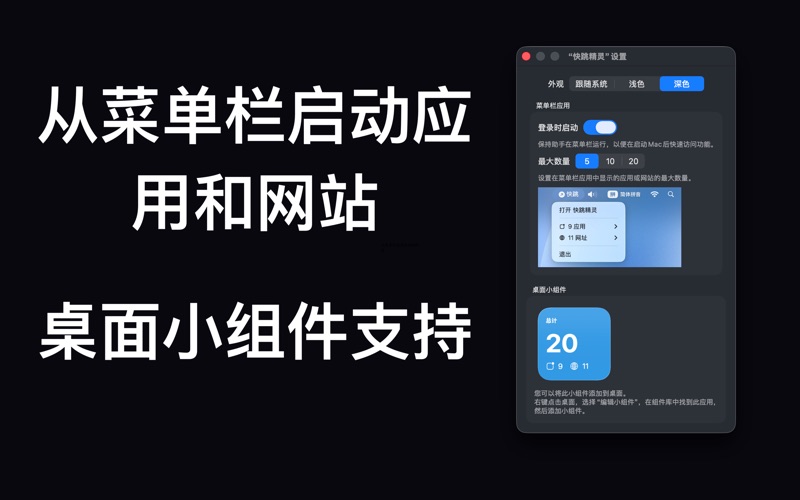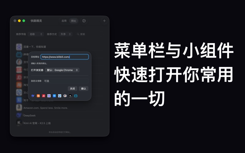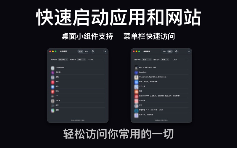 想要更快地访问常用应用和网址吗? 快跳精灵帮你用最便捷的方式启动应用和网站。 1. 一键直达,瞬间启动: 无论是你钟爱的专业软件,还是每天必访的网页链接,快跳精灵都能让你点击即达,无需等待。告别繁琐的寻找和切换,将注意力全部集中在工作上。 2. 菜单栏快速访问: 将你的常用 App 和网址固定在菜单栏!只需轻轻一点,即可从任何窗口、任何应用中瞬间跳转。工作流不中断,效率极高。 3. 桌面小组件,一览无余: 通过直观的桌面小组件,随时查看你收藏的应用程序和网址个数。点击小组件,还能快速打开主程序,让你即刻进行管理或启动。 4. 极简添加,轻松管理: “快跳精灵”的主界面设计极致简洁,操作直观。添加任何应用或网址都只需几秒钟,让你专注于收集最有用的快捷方式,而非学习复杂的设置。 5. 智能排序: 支持多种排序方式,无论是按名称、使用频率,添加时间,都能让你的启动列表井然有序。打造完全个性化的效率中心! 为谁设计? • 效率追求者: 希望最大化 Mac 使用效率,减少不必要操作。 • 开发者与设计师:频繁切换工具和查阅文档,需要一个顺手的快速启动器。 • 学生与研究者:快速访问学习资料、在线工具和参考网站。