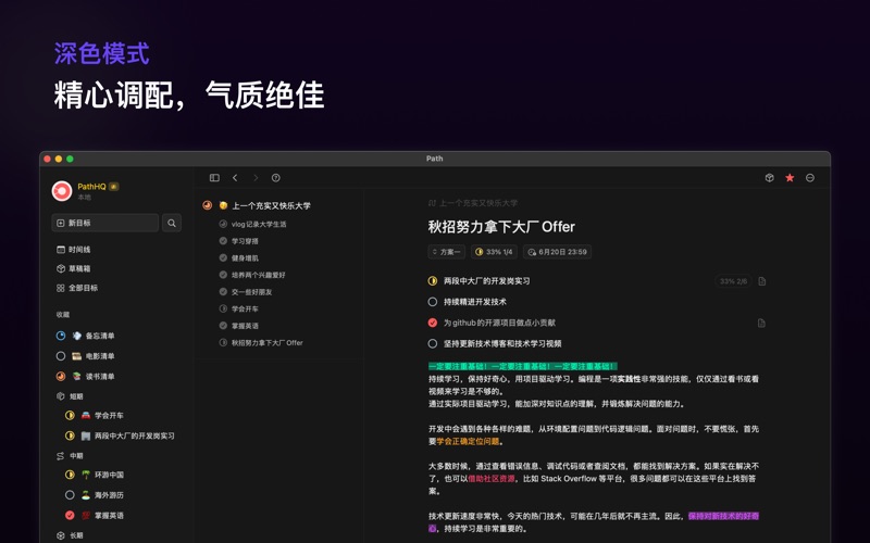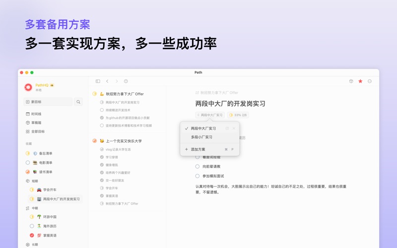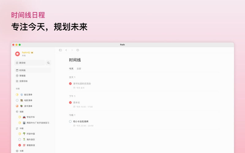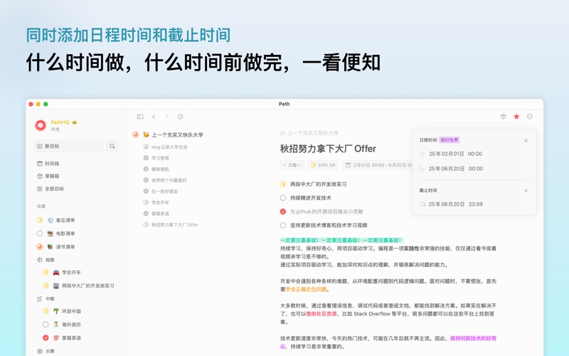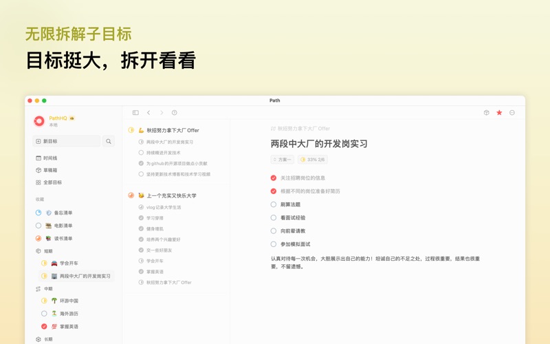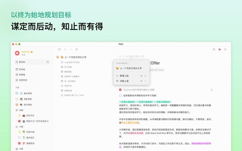Path是基于以终为始理念设计的创新GGD(Get Goals Done)目标管理工具。它与传统的GTD(Get Things Done)理念有所不同。 我们认为绝大部分要做的事情或要完成的任务都是手段,而非目的。传统的GTD理念追求以更快的速度完成更多事情,却忽视了这些事情的真正目的。Path则恰恰相反,我们将真正的目标置于首位。在此基础上,我们帮助用户规划出更完善、成功率更高、过程更轻松的实现路径。 【在高效管理个人目标领域,Path的独有特性】 - 双向无限拆解,以终为始地规划目标 你可以写下一个目标,接着反向探寻它的上层目标。当你确立了真正的目标后,你就可以根据实际情况无限拆解它,把大目标拆解成小目标,然后一步步实现。 Path可以帮你聚焦真正的目标,沿着实现它们的最优路径前行,更大几率做成想做的事。 - 添加多套备用方案对抗变化风险 Path认为世界在不停改变,因此提高用户应对变化甚至利用变化的能力是提高目标实现率的关键之一。 给目标添加备用方案能够帮助我们为可能的意外情况做好准备,当变化发生时也就不至于一筹莫展。 【更多实用功能】 - Path Memo-原生开发的块级笔记编辑器 - 同时添加开始时间、结束时间和截止时间 - 目标进度百分比、分数和精美的彩色checkbox - 将目标以短期、中期、长期进行分组收藏 - 时间线日程 - 原生开发 - 数据保存在本地 - 日历(即将支持) - 主流多平台支持(即将支持) 更多我们即将支持的新功能可到官网 pathapp.top 的右上角【路线】中查看。 【反馈联系】 邮箱:hipathteam@gmail.com 小红书:PathHQ 【订阅】 如果您订阅了Path标准版,付款将从您的iTunes账户中扣除,并在当前期限结束之前24小时内进行续费。若您需要取消订阅,可以在账户设置中进行操作,至少提前24小时。 【协议】 用户协议:https://pathapp.top/#/userAgreement 隐私政策:https://pathapp.top/#/privacyPolic 时间选择器重新设计