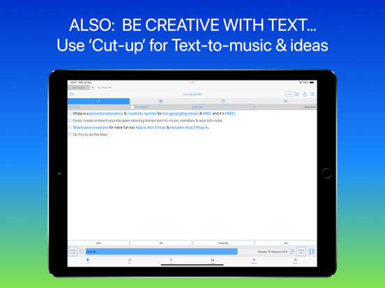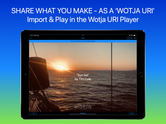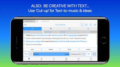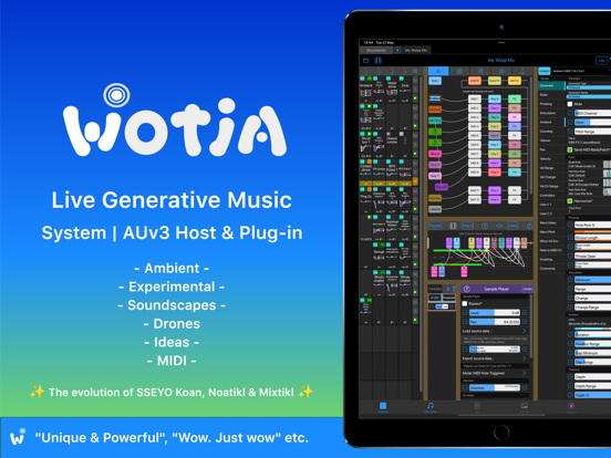 Wotja is powerful & 'AI-free' system for Live Generative Music & MIDI. Use it to easily create & play on-device generated ambient music, soundscapes, textured drones, text-to-music melodies/arps + so much more… • It's FREE, ad-free, updates are FREE & it can be used for FREE forever in Lite mode (Go Pro to do the max!) • It's actively developed & delivers awesome results • It's well loved & users say e.g. "A Masterpiece!" (wotja.com/reviews) • It's the *continued evolution* of 1990-02 SSEYO Koan (wotja.com/evo) which generated what became known as 'Generative Music' WOTJA BUNDLE FOR APPLE INCLUDES* • Wotja App (iOS, macOS) • Wotja AUv3 Plug-in (iOS, macOS) • Wotja Player App (tvOS [Flow Player], watchOS [Play control]) * iOS means for both iOS & iPadOS =+= FULL DETAILS ON WOTJA (it's very deep!) • wotja.com/app GENERATIVE MUSIC CREATOR, LAB & DAW • Powerful engines: Generative Music ['WME'], Audio ['WAE'], Text ['WTE'] & Script ['WSE'] • 100s of editable generative music templates & SFX presets + many SoundFonts & Samples • 48 interdependent Cells in 12 tracks for live mixing/sequencing • AUv3 Plug-in (macOS, iOS) • App Plug-in hosting: macOS [AUv3/AUv2], iOS [AUv3] • Support for: - Sleep timer - Export/import of Wotja URIs (WJURI) - Recording to WAV & MIDI [App, not Plug-in] - Core MIDI Out/In, Virtual MIDI Out/In, iCloud [iOS, macOS] - AirPlay [iOS, macOS] - CarPlay [iOS] - Ableton Link [iOS] - Text to Speech (TTS) [iOS, macOS, tvOS] GENERATIVE MUSIC PLAYER (3 TYPES) • 'Flow Player' to play Schemas (e.g. for use as sleep aid) • 'Album Player' to play Albums of Mixes & Schemas + auto-create/edit Albums • 'URI Player' to play, imported from clipboard, a shared Wotja URI (WJURI); supports API commands for use by 3rd Party Apps & Games =+= KEY *NEW FEATURES* IN WOTJA 26 ['W26'] • 26 IM Soft Piano SoundFont • WAE S&G Unit: Load Sample from SoundFont; Sample Offset; Sample Duration • WME Chording: Quantise to; Pitch Offset Range • Patterns: Don't Pad BRF to End; Meter Button (Editor) • Force Use of Mix Rules/Simplify All Rules • Updated Schemas, Piano Templates + • More: wotja.com/new W26 FEATURE SET ['26 FS'] • wotja.com/fs =+= W26: INCLUDED MODES OF OPERATION • Lite [Default]: Very capable but MIDI Ch1 Out/In only; no save/export; various auto-timeouts & other limitations. • Pro: *All* Lite mode Limitations unlocked; Recordings licensed for Commercial Use (see EULA). • Play 26: Lite mode Auto-timeouts permanently unlocked in *the 3 Player modes only* and for the *26 Feature Set only*. • Pro 26: As Pro above, but where Lite mode Limitations are permanently unlocked for the *26 Feature Set only*. W26: IN-APP PURCHASE ['IAP'] OPTIONS • Subscription ['SUB'] (Pro) - Whilst active unlocks Pro mode in all Wotja 23+ Apps & Plug-ins installed under your App Store User ID. - Period is 1 month, auto-renewing; easy to cancel. - Prices shown are for US region & may change from time to time. - Payment will be charged to iTunes Account at confirmation of purchase. - Automatically renews unless auto-renew is turned off at least 24-hours before the end of the current period. - Account will be charged for renewal within 24-hours prior to the end of the current period. - May be managed by the user & auto-renewal may be turned off by going to the user's Account Settings after purchase. • Thirty Day Unlock ['TDU'] (Pro) - For thirty days from date of purchase unlocks Pro mode in the Wotja App & Plug-in but *only* on the device on which it is purchased AND provided the App is not uninstalled. • One Time Buy ['XX OTB'] (Pro 26/Pro 26 Mobile/Play 26) - As relevant, permanently unlocks Pro 26/Play 26 mode in every Wotja 26+ App & Plug-in installed under your App Store User ID. - Does *not* unlock the relevant mode for New Features in Wotja 27 or later & whilst use of any such New Feature is detected by Wotja it will operate in Lite mode. =+= FEEDBACK/ISSUES? • wotja.com/contact Thank you for using Wotja! This is a hot fix update to the new major version 26.0. HOT FIX (26.0.2) - FIXED: Crash when selecting Editor UI when an FX unit is in full screen mode IN 26.0.0 RELEASE ++++++++++++++ NEW FEATURES - One Time Buy "Play 26" IAP - One Time Buy "Pro 26 Mobile" (iOS/iPad OS only) IAP - WAE SoundFont Player Unit > 26 IM Soft Piano SoundFont - WAE Sample & Granular Unit > Load Sample from SoundFont; Sample Offset; Sample Duration - WME Chording > Quantize To; Pitch Offset Range - BRF Patterns > Don't Pad BRF to Bar End; MeterButton (Editor, Pro only) - Schema Editor > Test buttons: Mix, Album, Flow; Force Use of Mix Rules - Music Mode Cell Actions Menu > Force Use of Mix Rules; Simplify All Rules; Simplify Cell Rules - Schemas > Various Schemas updated - Templates >26 Soft Pianos & 26 Generator Types - SFX Presets > 26 Soft Piano IMPROVEMENTS - Support for Apple Car Play - Enter In-App Store for reset of 1st play Lite mode Auto-timeout - Loading Spinner now has central 'details' field - Applied Simplify All Rules to all included Templates - All WME Envelopes are now 'flat' values by default - Settings > Show/Use WME Envelopes checkbox - WME "Velocity" envelope params now under "Feel: Timing" - WME "Micro" params renamed to Feel: Timing, Pitch, Volume - (old XX OTB?) It's now easier in Wotja to see New Features - Default menu item added to WME Parameter Edit Controls - Settings button added to In-App Store screen FIXED - Various bug fixes (see website) CHANGED - Renamed WAE SFDLS Unit to SoundFont Player - Minor changes made to default Harmony, Rhythm & Next Note Rules - Removed Support for Inter-App Audio (IAA) & AudioBus SDK FULL DETAILS: wotja.com/releases/#w26-0-0 P.S. Enjoying using Wotja? It really helps us if you update your review or leave another rating. Tx!