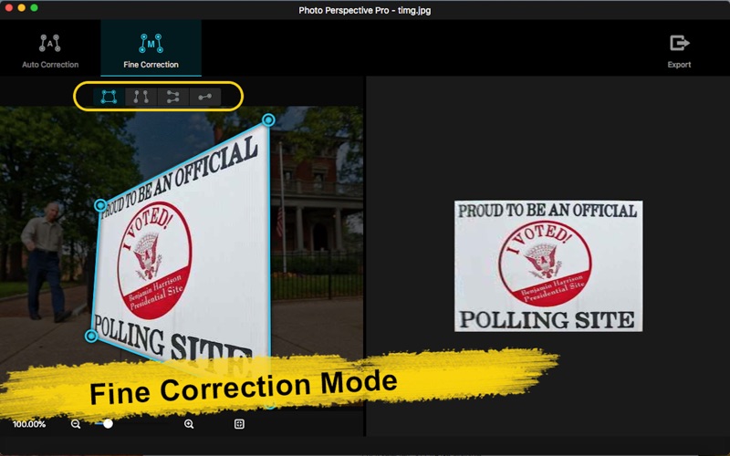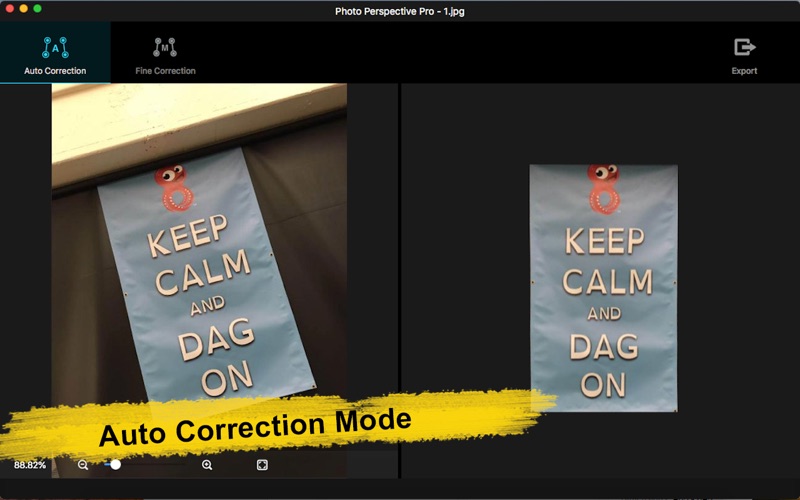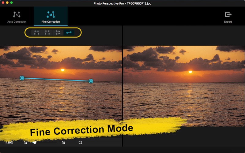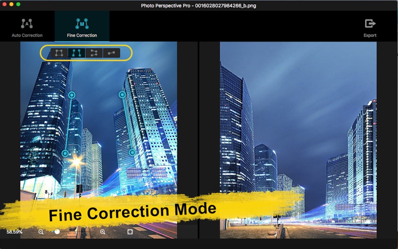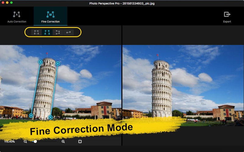 Photo Perspective Pro可以轻松完美解决以下问题: -照片中扭曲、变形、不平衡、倾斜等问题; -图片中倾斜的对象;图片中呈一定角度的对象; -倾斜的地平线; -倾斜、透视的街道照片; -歪斜的建筑图片; -裁剪出四边形区域的变形图像并校正; -增强透视效果:增强垂直方向的透视变形效果; -增强透视效果:增强水平方向的透视变形效果。 支持导入70多种常用图像格式,图片缩放,窗口缩放,鼠标移动图片,保存修正图片等功能。 Photo Perspective Pro版有自动修正和精细修正两种操作模式供您选择。在精细修正模式中,还提供了四种高级工具供您进一步选择以便调整出最佳效果! 1.自动修正 系统自动识别变形图片,自动识别校正图片的边缘,自动校正图片,只要输入原图,即可获得专业的修复效果。 -直接将图片拖进软件或者拖到图标上; -自动识别并纠正复杂的透视问题; -自动识别优化至最大可视区域; -保存修正图片。 2.精细修正 在精细调整模式中,有4种高级工具可以根据您的需求喜好选择,进行调整和修复图片。 -四边形修正,最优控制选择想要区域,同时修复变形效果; -单线修正,可以校正图片中的水平倾斜问题,非常适合拉直地平线; -垂直双线修正,可以修复垂直方向的倾斜透视变形问题,亦可以用来增强垂直方向的透视变形效果; -水平双线修正,可以调整水平方向的变形,亦可以用来增强水平方向的透视变形效果; -实时显示修正后效果图; -保存修复图片。 如果您在使用过程中有任何问题,可以发送邮件到ColorLemonStudio@yeah.net。 1. 修复一个小bug.