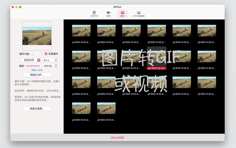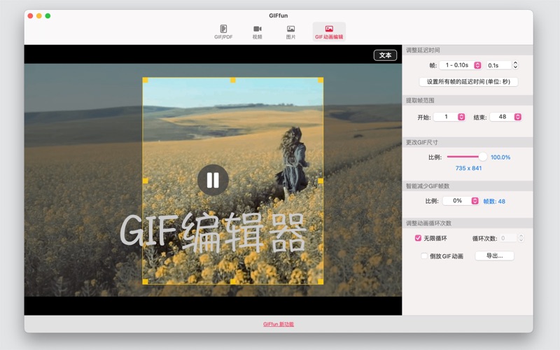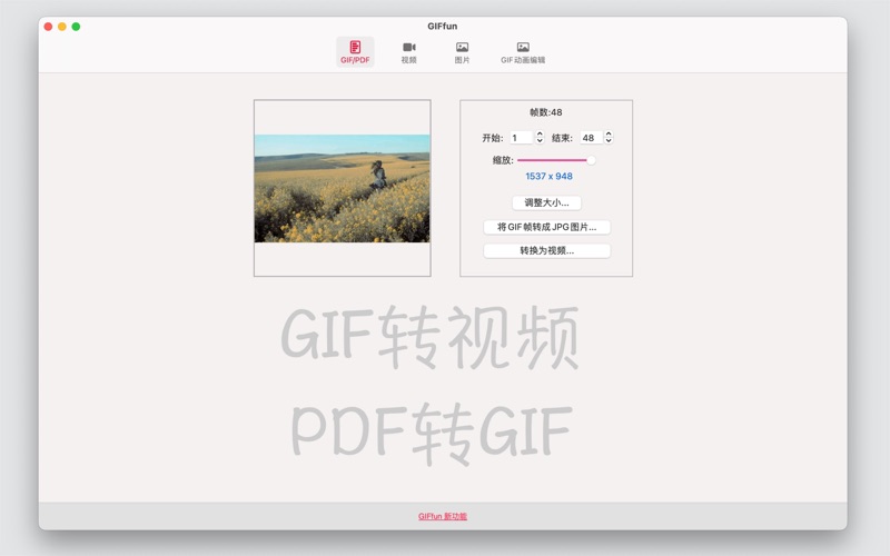GIFfun是一款GIF制作工具,可让您从生活照片和视频中创建GIF动画。可在几秒钟内为您的照片/视频制作GIF动画。 主要功能 1. GIF转视频 将GIF转换为视频。 2. 视频转GIF 将视频转换为GIF。 3. 照片转GIF 将多张照片转换为GIF。 4. 照片转视频 将多张照片转换为视频。 5. GIF转JPG 将GIF选择的帧导出为JPG图片。 6. 调整GIF大小 更改GIF尺寸。 7. PDF转GIF 将PDF转换为GIF。 8. PDF转JPG 将PDF选择的页面导出为JPG图片。 9. 裁剪视频 将视频裁剪为短视频。 10. GIF编辑 反转GIF,智能降帧,裁剪GIF,添加滤镜,添加文本,调整延迟时间和循环次数等。 您需要升级到专业版才能解锁以下功能。(在应用程序内购买) * 裁剪视频 * * 视频转GIF * * GIF转视频 * * 照片转视频 * 1. 提升整体稳定性,优化使用体验 2. GIF编辑功能新增滤镜效果