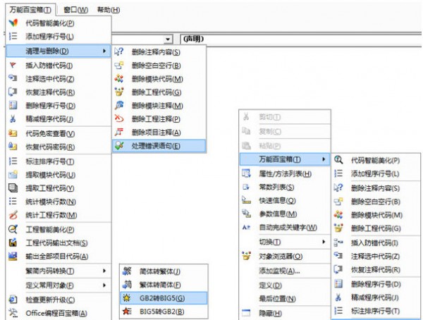VBA百宝箱是一款基于Office的编程开发软件,能够为用户提供代码美化排版、繁简内码转换、插入字符、删除代码、一键录入常用代码等多种功能,有效提高你的编程效率,有需要的用户欢迎下载使用!