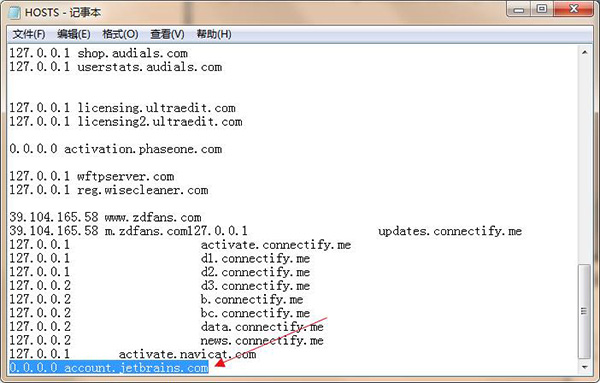 6、安装完成后到目录:C:WindowsSystem32driversetc用记事本打开“HOSTS”并添加代码“0.0.0.0 account.jetbrains.com”然后保存