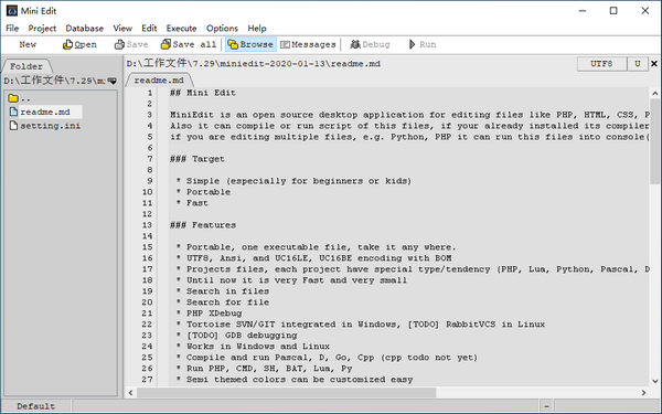 MiniEdit是一个开源桌面应用程序,用于使用UTF8编码编辑PHP、HTML、CSS、Python、D、C和Pascal等文件。如果您已经在系统中安装了编译器,它也可以编译或运行这些文件的脚本,而不需要为其打开项目,如果您正在编辑多个文件,例如Python、PHP,它可以将这些文件运行到控制台(cmd)或终端(xterm)。