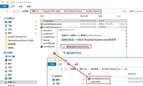5、安装完成后将破解补丁复制到安装目录下替换原文件即可,一般默认安装目录为:C:Program Files (x86)SQL Maestro GroupAnySQL Maestro