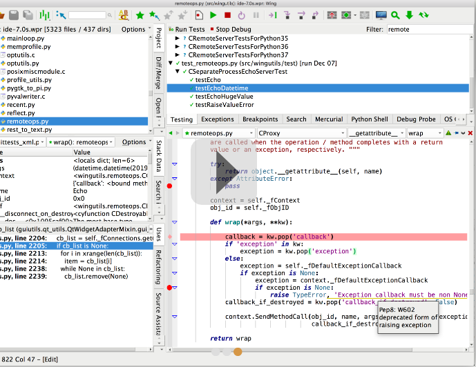 WingIDE是个相当优秀的IDE;其编辑器包括大量语言的语法标签高亮显示,虽然它只是个面向Python 的工具。源代码浏览器对浏览项目或模块非常实用(表现在可导航源代码和文档行摘要中)。虽然没有监视器,但调试器设计得很好。编辑器有优秀的命令自动完成和函数跳转列表,但是没有代码合并。面向项目风格的 IDE 对于大型产品非常有用(在这方面,除了 Komodo 以外,它是大多免费 IDE 中较好的)。总体的界面就像增强的 Idle,使用了与许多 TK 和 XWindow 界面类似的“多窗口”排列方式。使用对接和嵌入(这方面,并不是过多使用MS Visual Studio 造成的),但不同的开发人员可能喜欢不同风格的窗体。WingIDE 是个很有前途的开发环境。