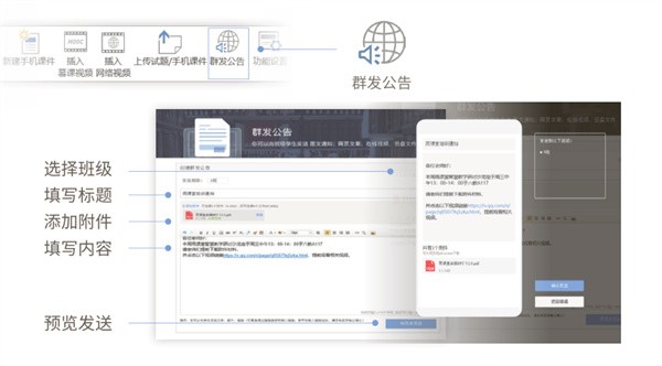 通过【群发公告】可向班级学生发送图文通知、网页文章、在线视频及云盘文件等。