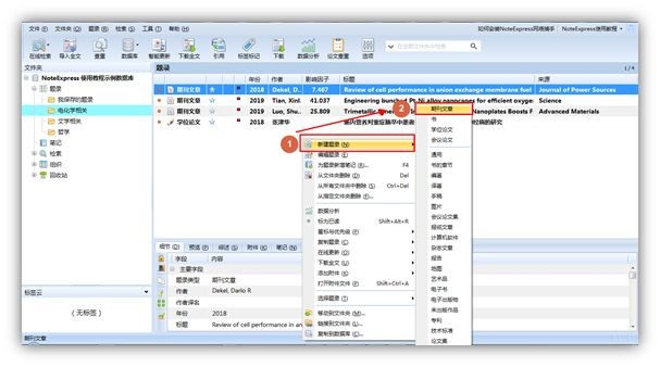 紧接着,在题录列表栏空白处单击鼠标右键,然后选择「新建题录」→「期刊文章」跳转至新建题录窗口。
