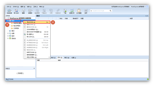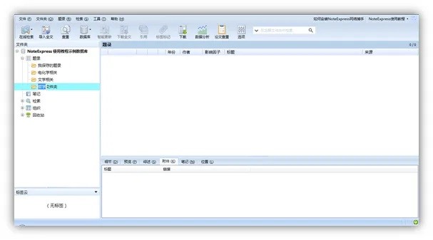 文件夹栏:展示当前打开数据库的目录结构,NoteExpress 支持建立多级文件夹结构,支持同时打开多个数据库;