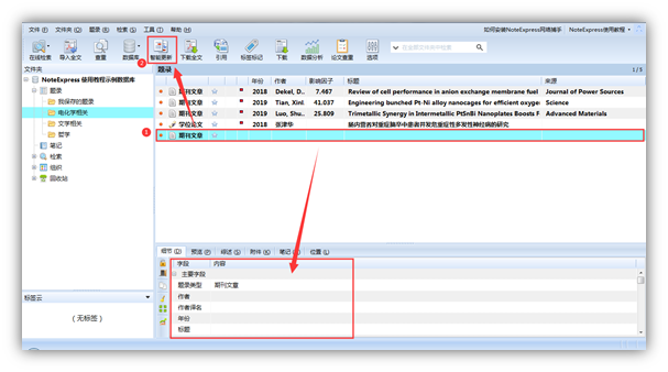 题录列表栏:展示当前选中文件夹内存储的题录,题录是 NoteExpress 管理文献的基本单位,由文献的元数据信息、笔记和附件三部分构成。