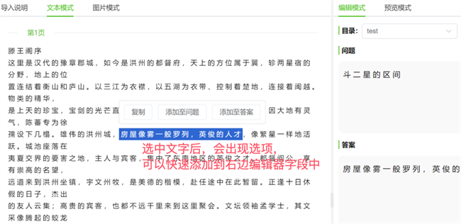 文本模式下,可以将文字选中添加到右边编辑区域。