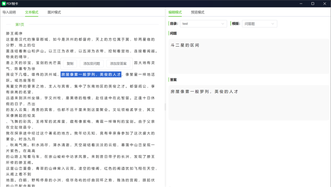 导入PDF文件后制卡界面分了两个区域,左边是内容区,右边是编辑区。支持两种模式,文本模式和图片模式。