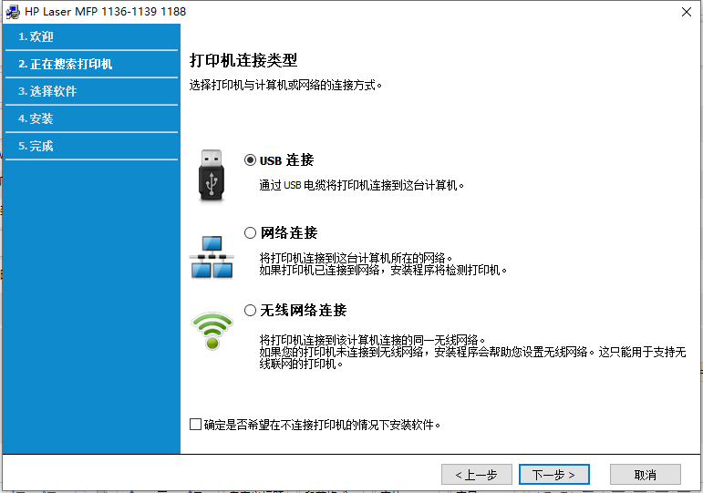 5、选择打印机连接类型,勾选usb连接,点下一步