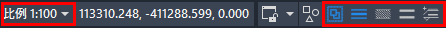 状态栏的比例控件可设置当前比例和修改对象比例,提供了编组、墙基线显示、加粗、填充和动态标注 (对标高和坐标有效) 控制。