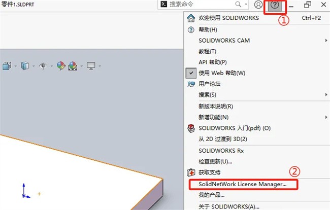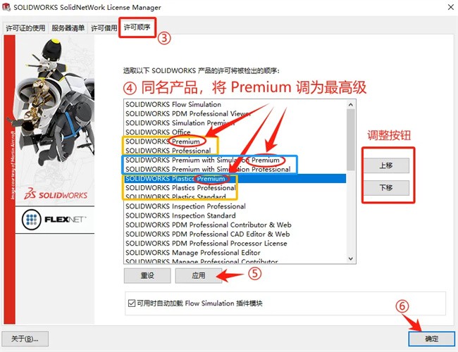 打开软件,依次点击右上角 问号?→SolidNetWork License Manager→许可顺序,选择 SolidWorks Premium 上移到顶部,点击 应用→确定