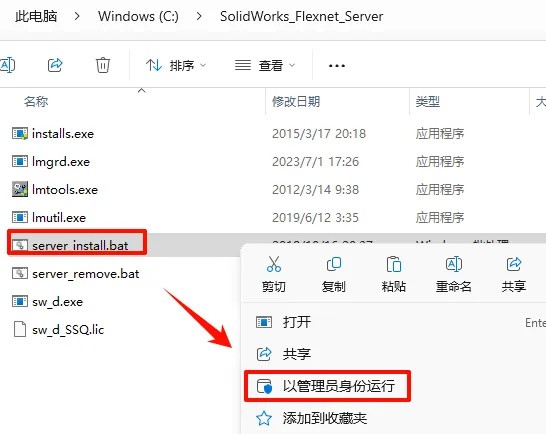 将 SolidWorks_Flexnet_Server 文件夹复制到C盘,右键管理员运行 server_install.bat
