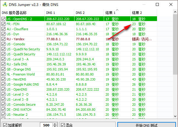 4、最快DNS查找功能,点击底部的开始测试按钮就可以在软件界面显示DNS延迟结果