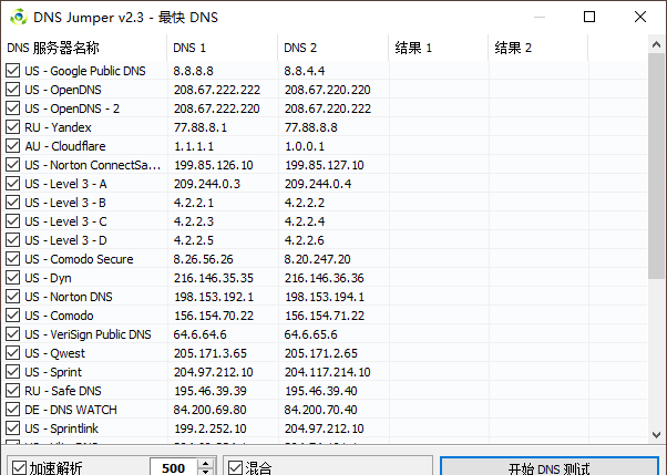 dnsjumper测试工具电脑版已汉化修改,进入就是中文,无需再另外设置,作为dns切换工具,可以快速切换dns,内置几十组dns服务器地址;无论处于什么环境下,都能帮助用户快速修改,哪怕是谷歌dns服务器,也有!此版本无需付费,完全免费使用!