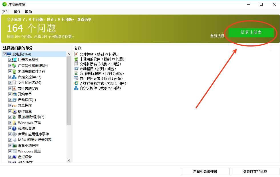 快速扫描注册表:几十秒就能出结果,主要包括 COM/ActiveX、无效文件路径、软件设置残留等。
