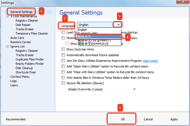 3.在【General Settings】找到“Language”展开语言界面,选择“简体中文”后点击“OK”即可将页面设置为中文