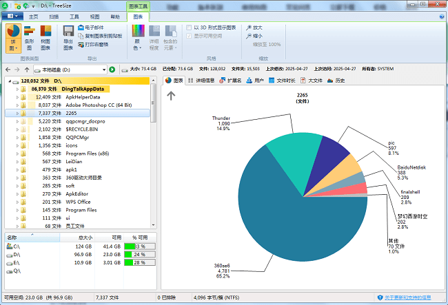 TreeSize可以扫描指定的磁盘分区或文件夹,显示每个文件夹及其子文件夹的大小。用户可以通过树状图或饼图直观地理解磁盘空间的分配情况