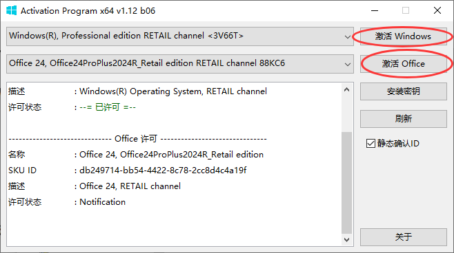 打开软件后,程序会自动读取设备的Windows系统和已安装的微软 Office 版本,用户只需点击需要的激活项目按钮即可完成激活。