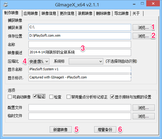 如上图,首先选择将要备份的路径[1],选择系统盘(一般系统装在C盘),wim镜像保存的路径[2],然后输入备份文件的信息和描述[3],选择压缩比率[4],填写显示名称/标识等,最后,如果你是首次备份则选择新建映像[5],如果你之前已经有备份过,则选择增量备份[6],软件即会开始对系统进行备份了,备份速度因文件大小、机器性能、压缩比有关,不过个人认为速度还是很快的,特别是增量备份的时候。
