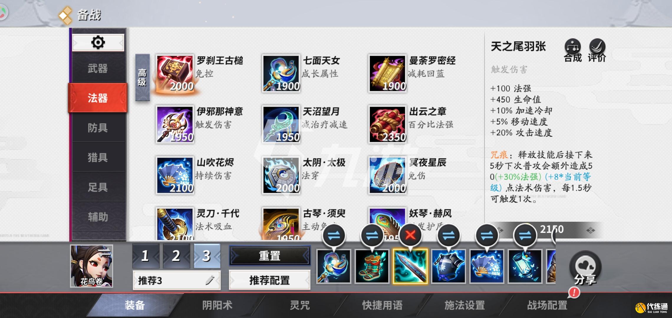 第三件装备我们就出天之尾,这件装备也可以提高我们的移动速度和生命值还有法强,,同时这件装备还可以增加攻击速度,增加了攻击速度后,对线时的强度就很高了,对线期不断的平A可以很轻易的建立血量的优势。