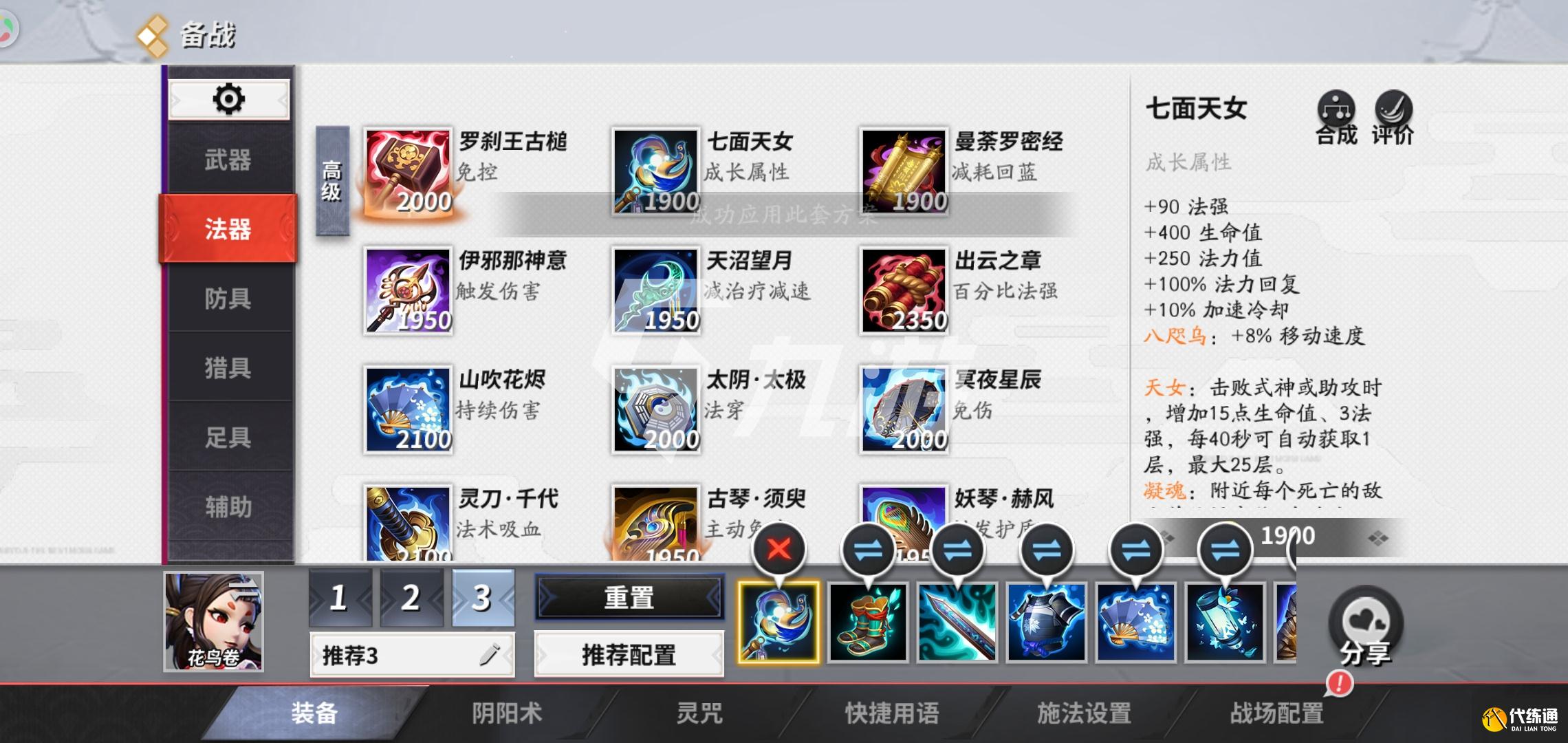首先第一件装备我们就出七面天女,这件装备可以说是很合适上单花卷鸟出的,可以增加自己的血量的同时,也可以提高蓝量的回复和法力值,出了这个装备后花卷鸟点人的伤害就很高了,而且不害怕在线上没有蓝量,因为这件装备可以不断为我们回复蓝量,同时这件装备还是一件成长型的装备,可以在我们击杀敌人或者是获得助攻后可以增加血量和法强。