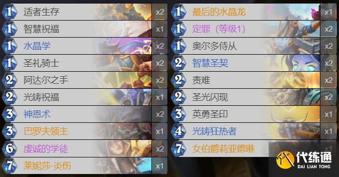 在水晶龙的起手留牌方面,主要是留下适者生存,智慧祝福,智慧圣契,圣光闪现,英勇圣印以及优质低费随从例如圣礼骑士,奥尔多侍从。