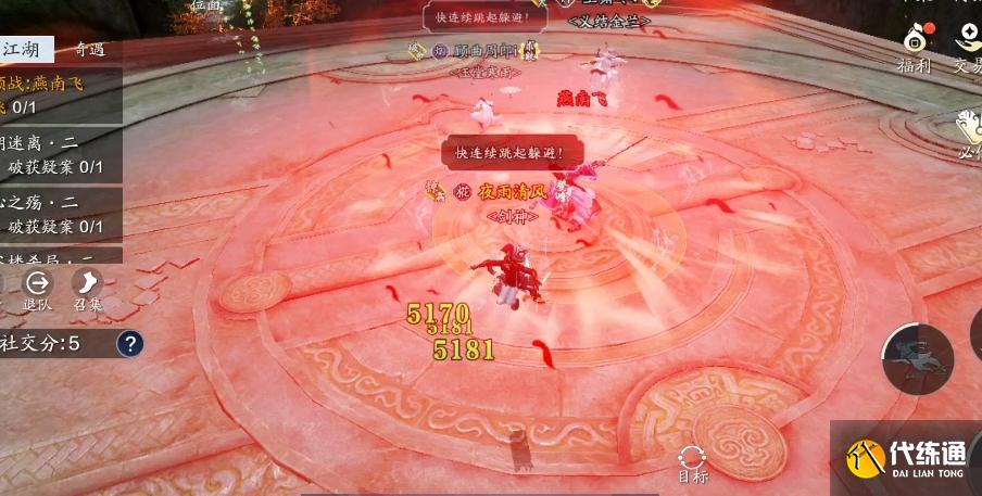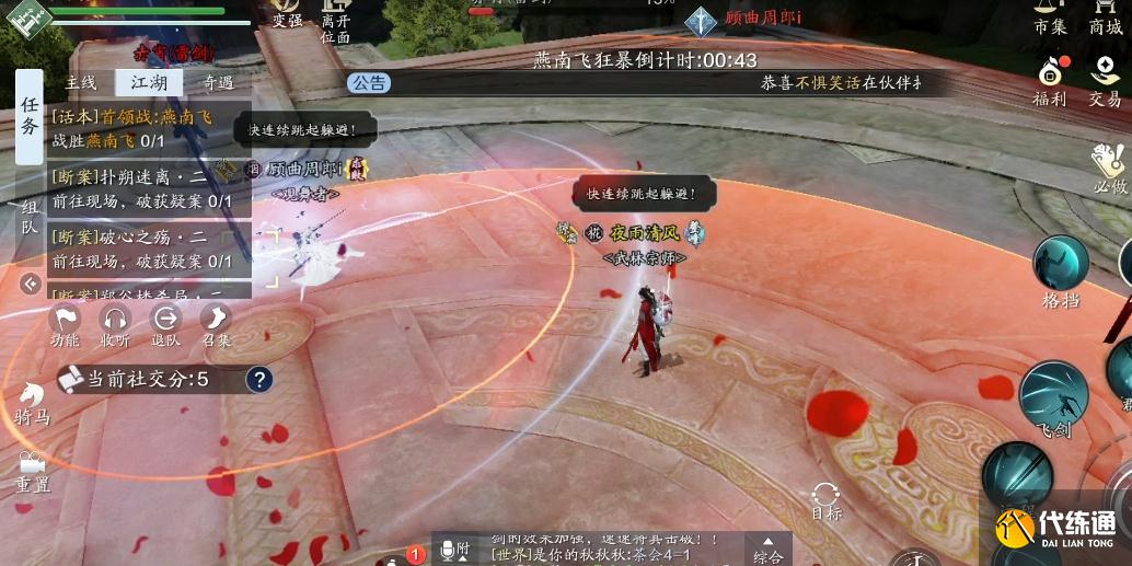 燕南飞第四阶段之后会释放全屏技能【花魂绽放】,释放之前脚下有花瓣提示,等到红圈出来之后再三段跳。