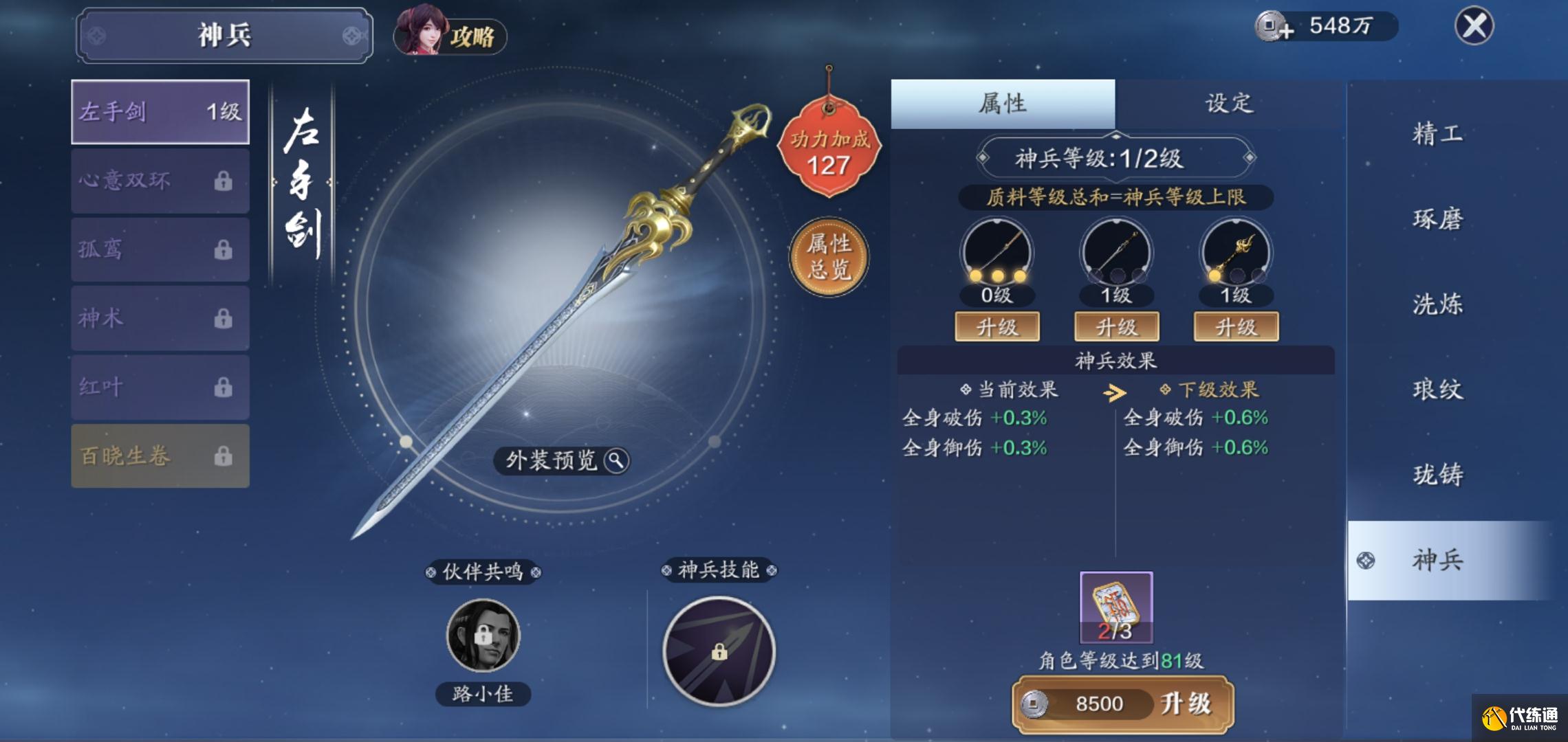 众所周知,紫色神兵分为五个选项,玩家要选择最适合优先培养的,首选:左手剑。其次:孤鸾、神木。金色神兵,有能力的玩家,点满就行,这里不强求。