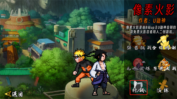 像素火影次世代白面具是一款以火影忍者动画为灵感而制作的动作竞技向游戏,玩家将可以在游戏中自由的进行模式的选择,并在对应的模式之中进行忍者角色的选择,有经典的鸣人、卡卡西等,除了角色的选择之外,玩家还将需要进行角色忍术以及秘卷等的选择,这些将会丰富角色的战斗效果,快来尝试看看吧!